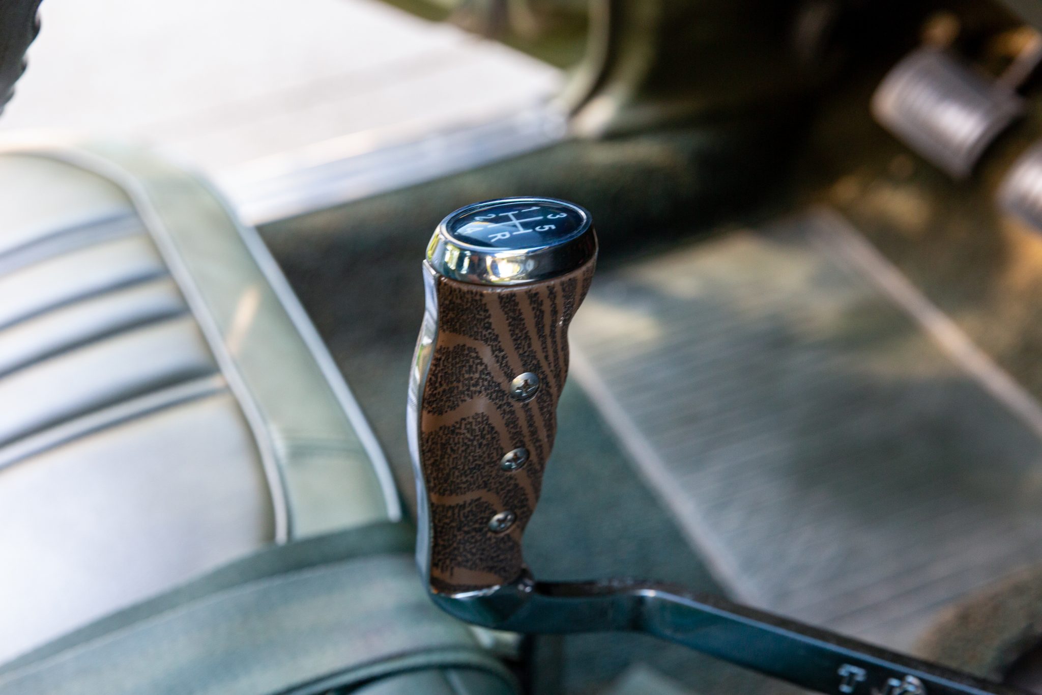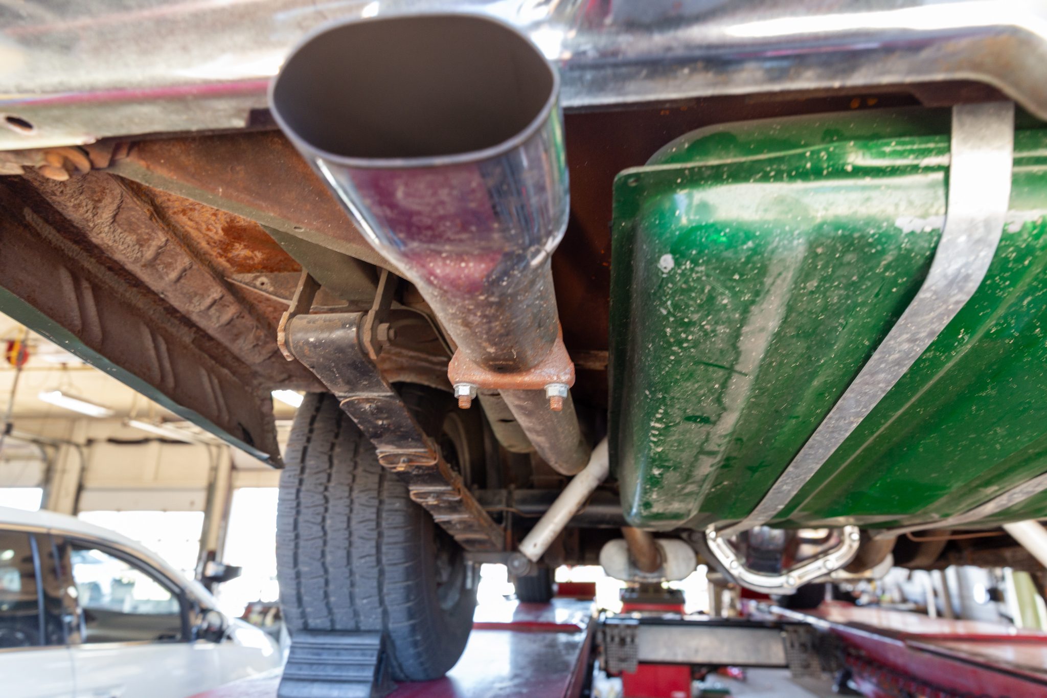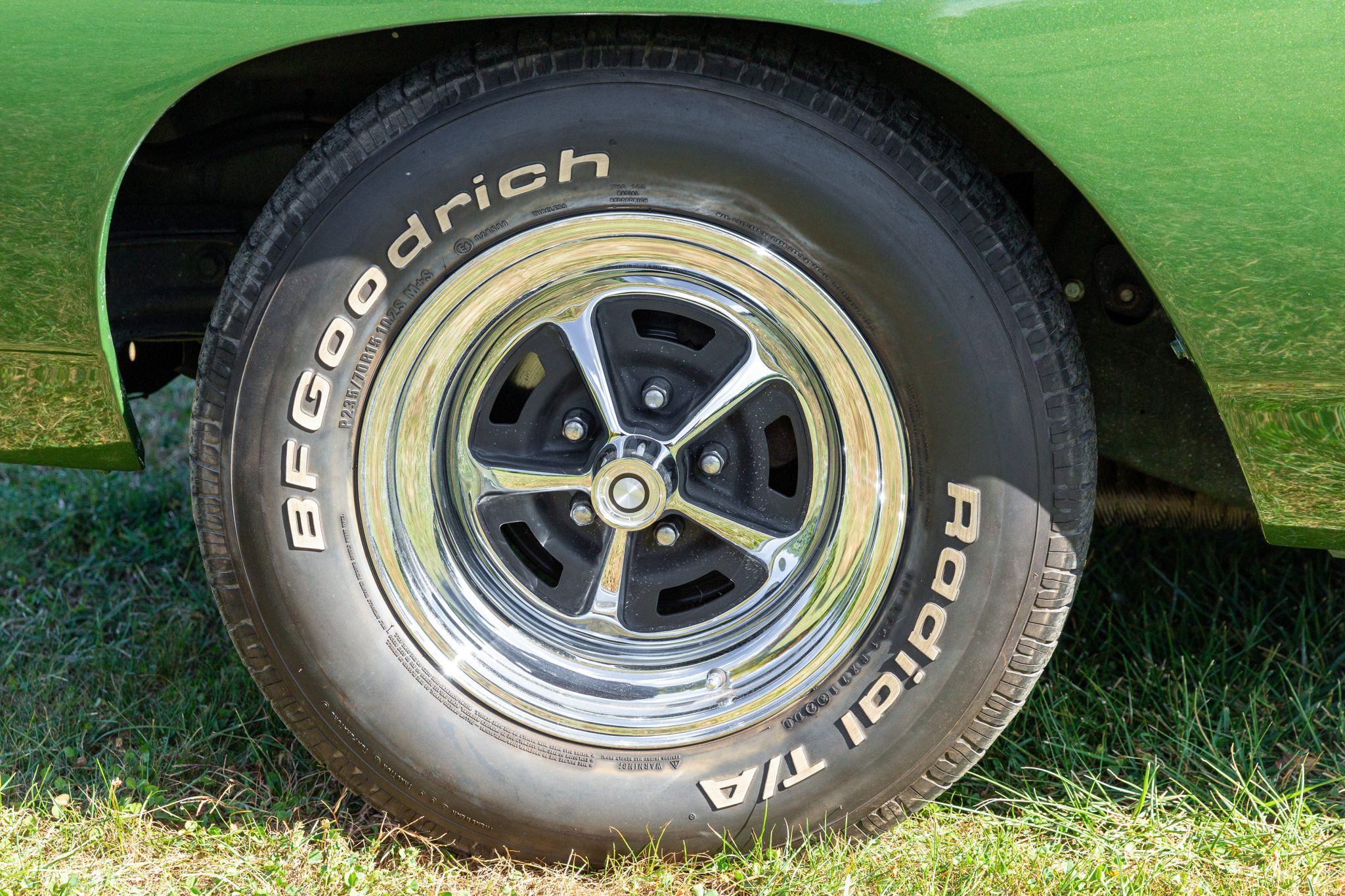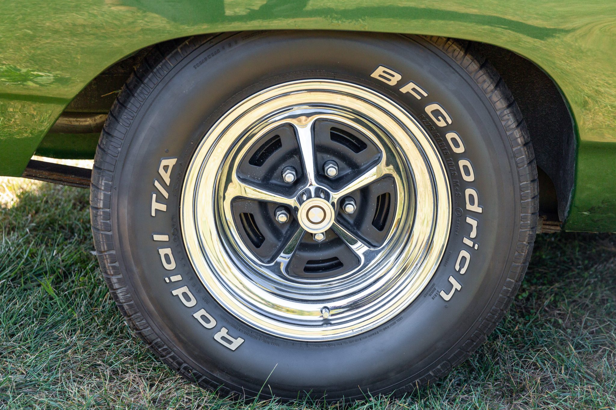 Magnum 500–style 15″ wheels with polished lips are mounted with 235/70 front and 275/60 rear BFGoodrich Radial T/A white-letter tires. The suspension was refurbished around 2012. Braking is provided by power-assisted front discs and rear drums, and the steering also is power assisted.