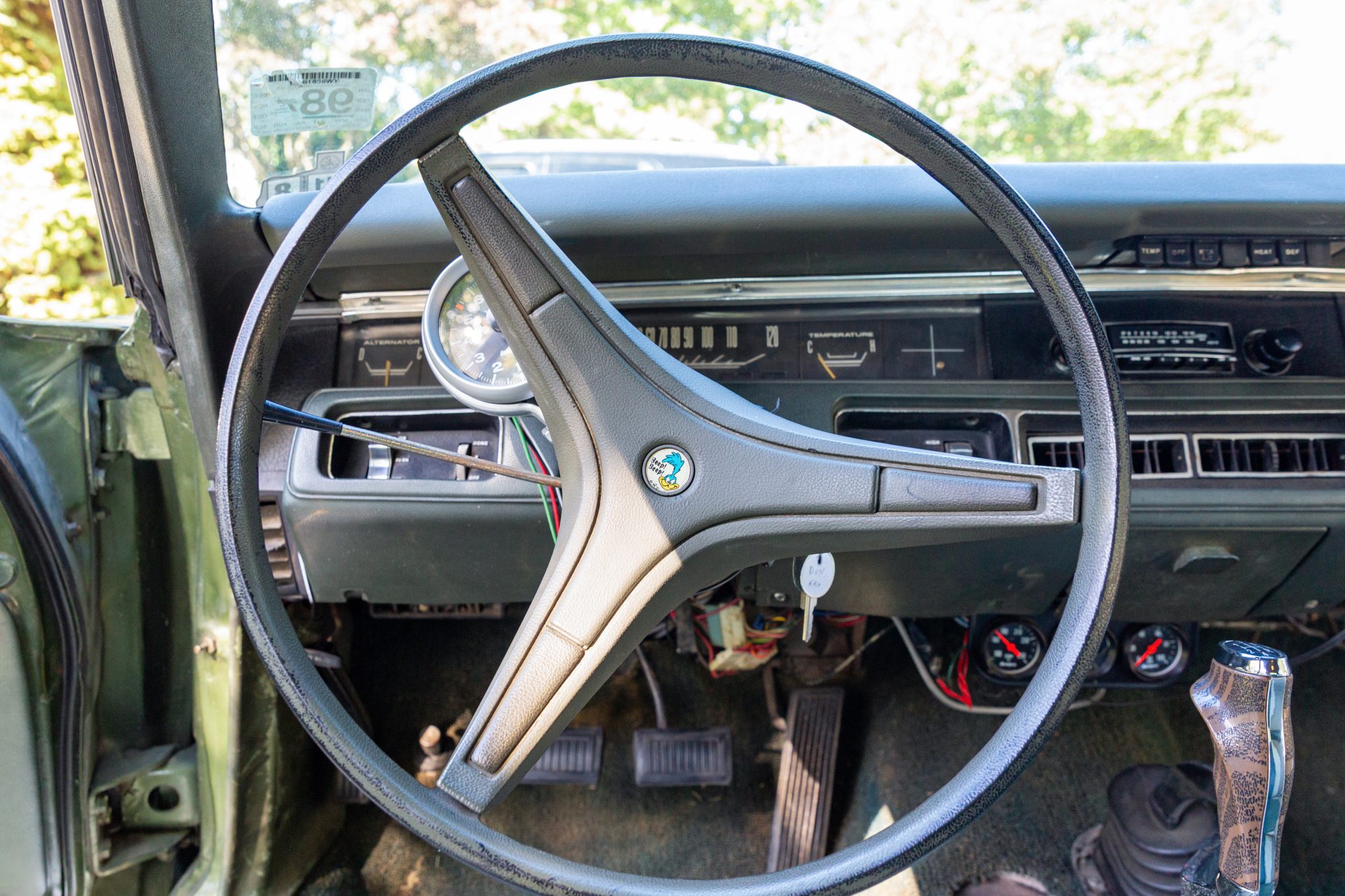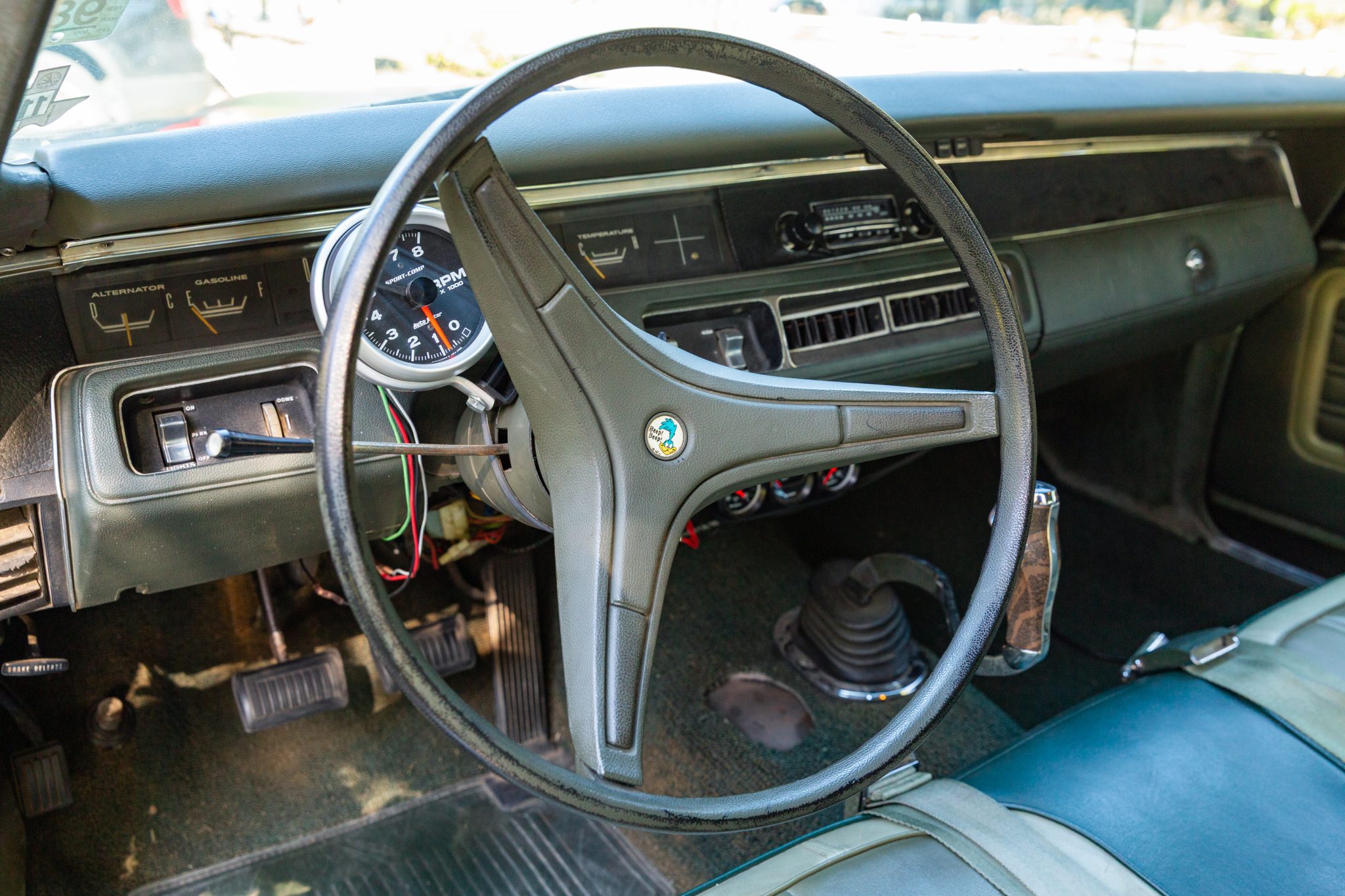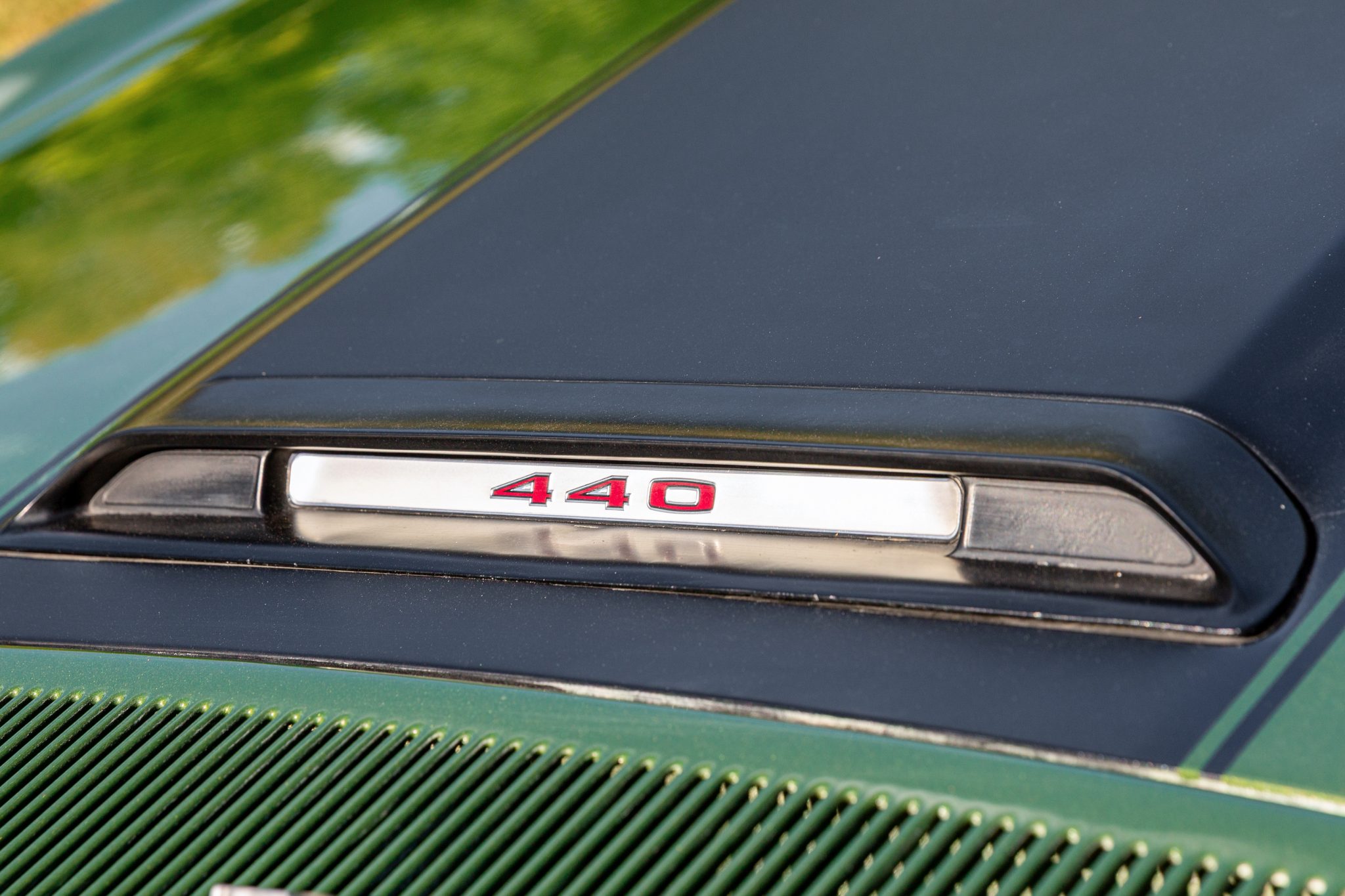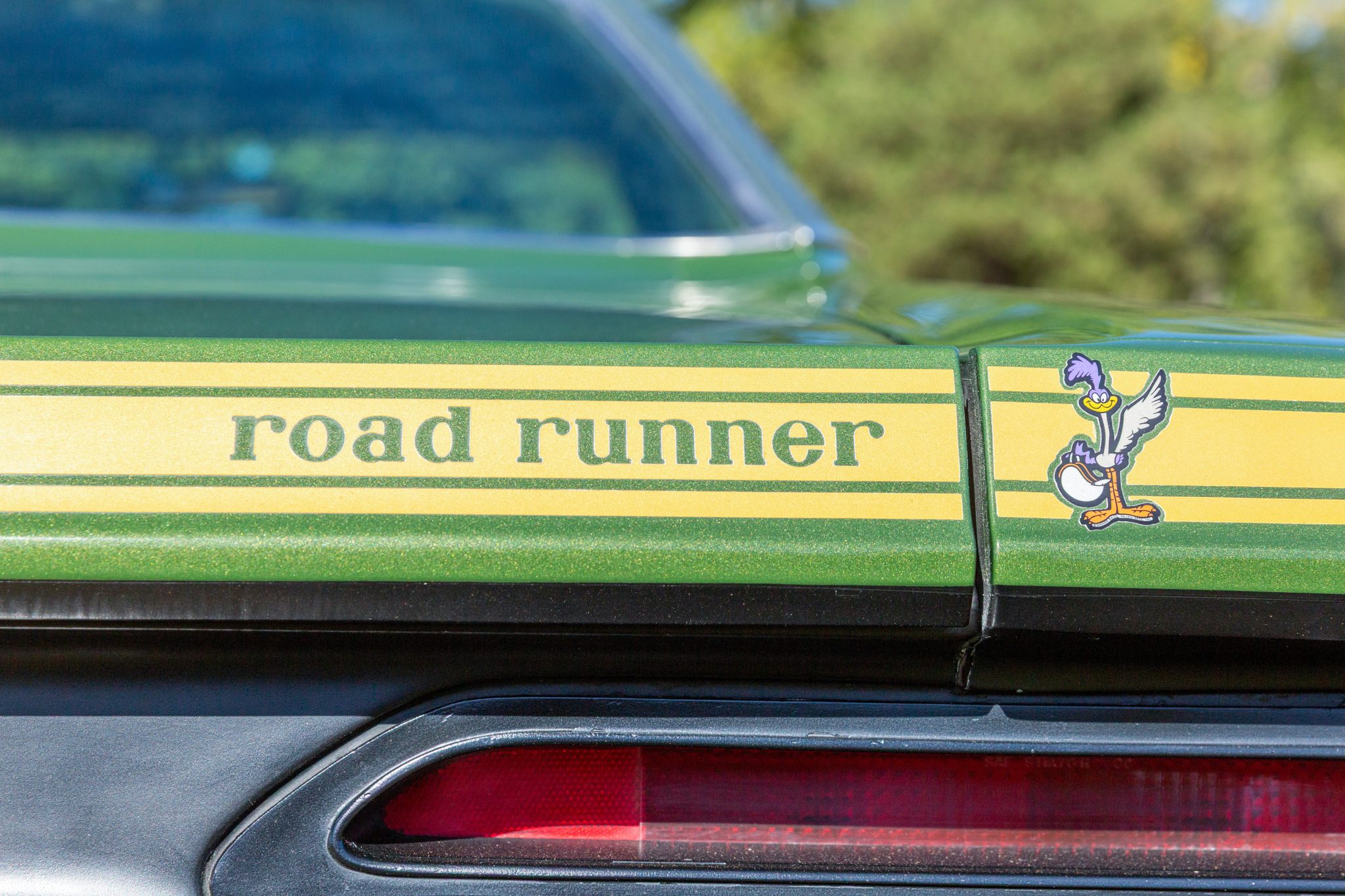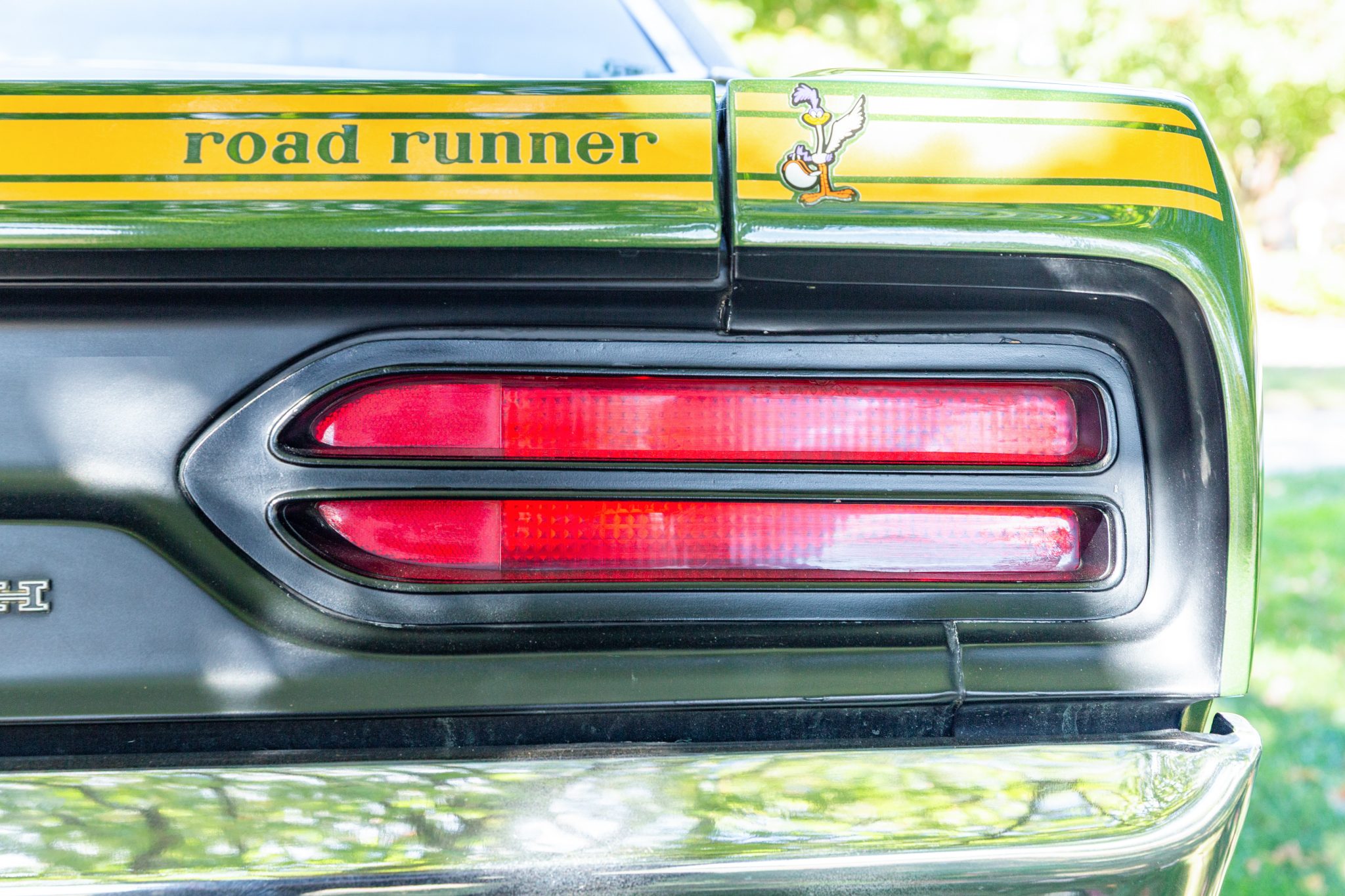Finished from the factory in Lime Green Metallic (FF4), the car was repainted under previous ownership and features a green vinyl roof. A Road Runner–style bulged hood with black accents and 440-badging has been installed, and Road Runner graphics have been added at the rear of the vehicle and along its sides. Other exterior equipment includes a black tail panel, dual exhaust outlets, simulated side scoops, dual side mirrors, a bright grille, and chrome bumpers. The seller notes missing trim around the windshield, bubbling paint, and touch-up work.