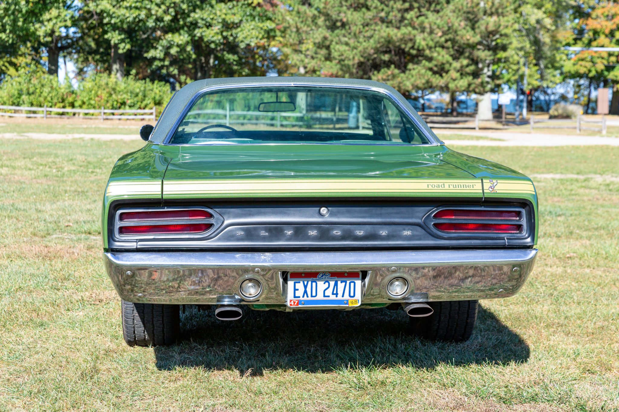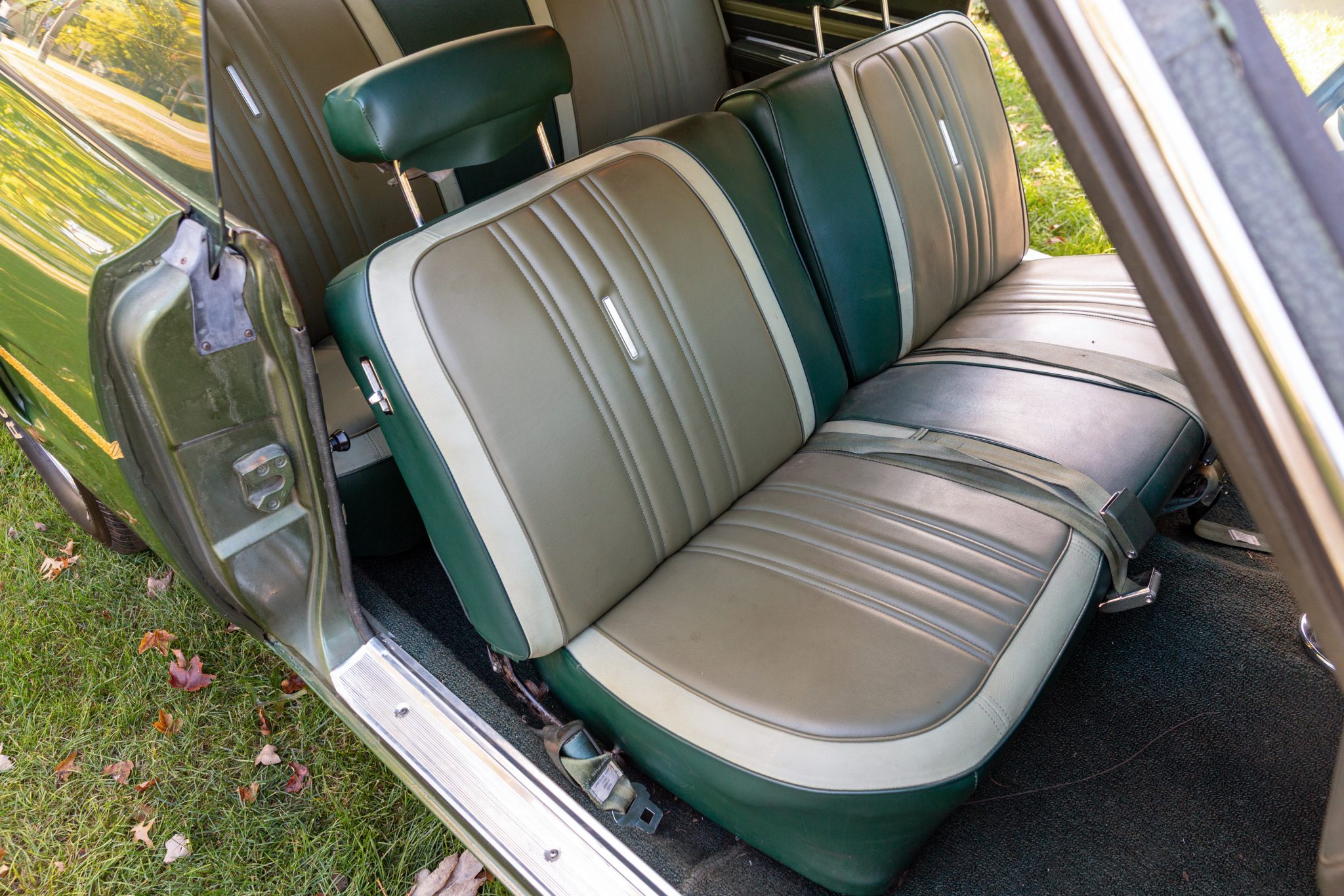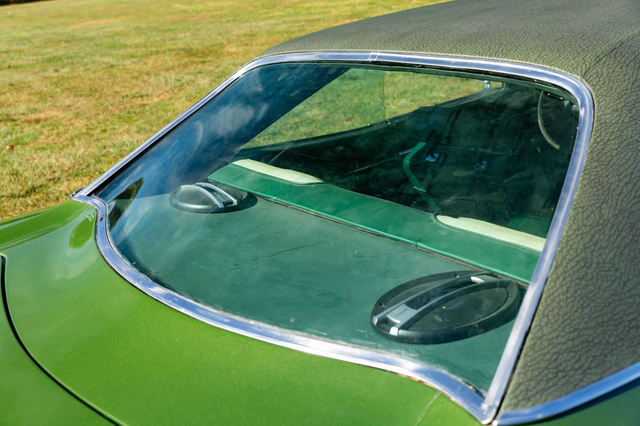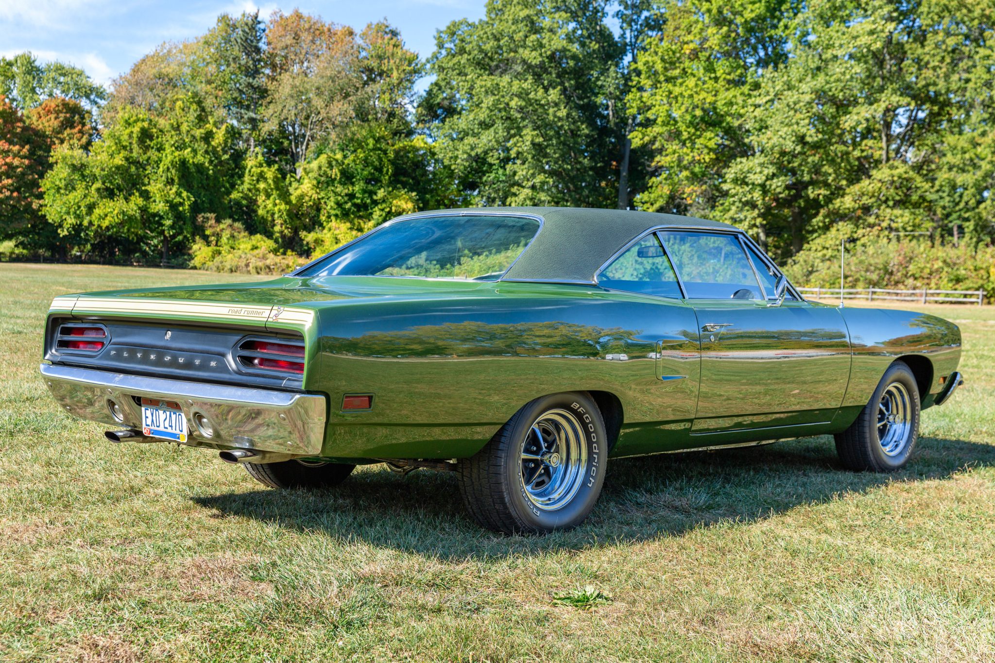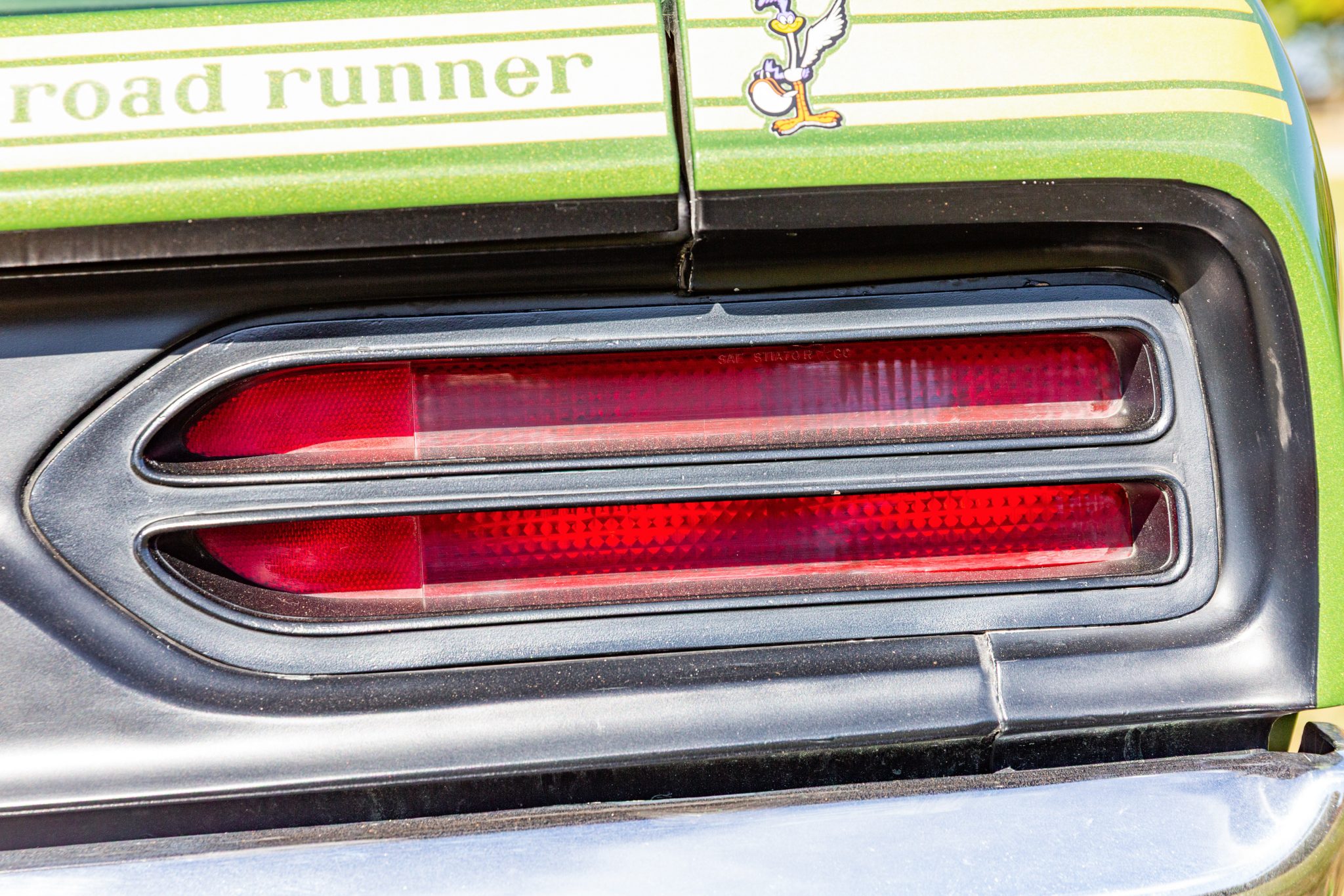 Finished from the factory in Lime Green Metallic (FF4), the car was repainted under previous ownership and features a green vinyl roof. A Road Runner–style bulged hood with black accents and 440-badging has been installed, and Road Runner graphics have been added at the rear of the vehicle and along its sides. Other exterior equipment includes a black tail panel, dual exhaust outlets, simulated side scoops, dual side mirrors, a bright grille, and chrome bumpers. The seller notes missing trim around the windshield, bubbling paint, and touch-up work.