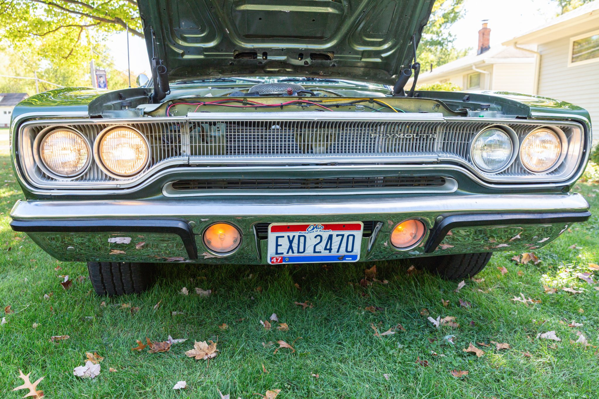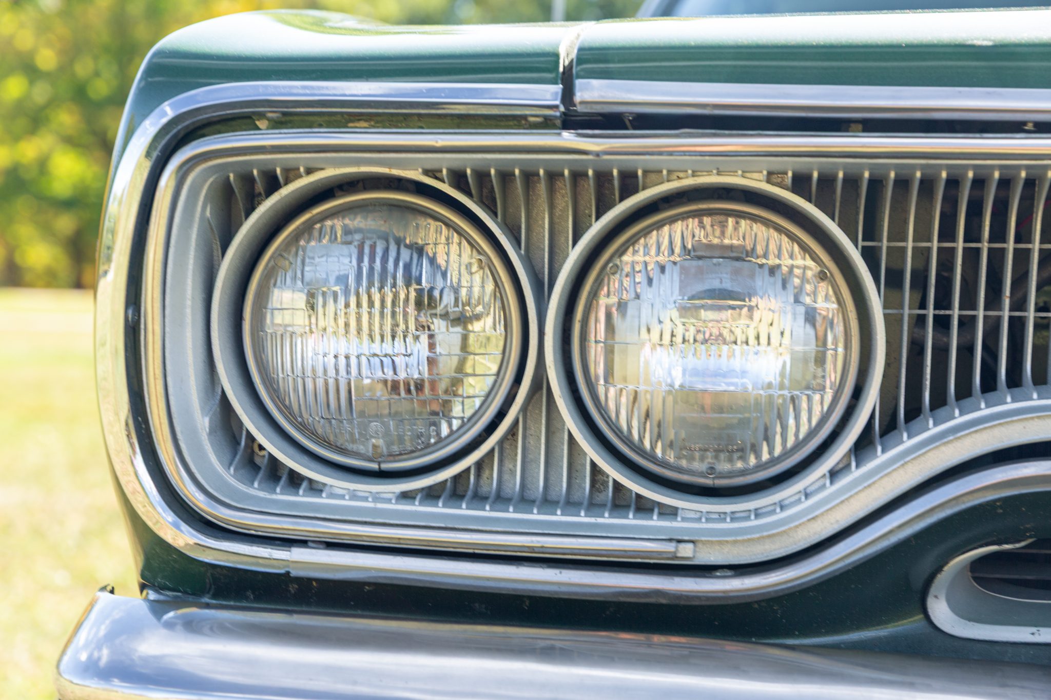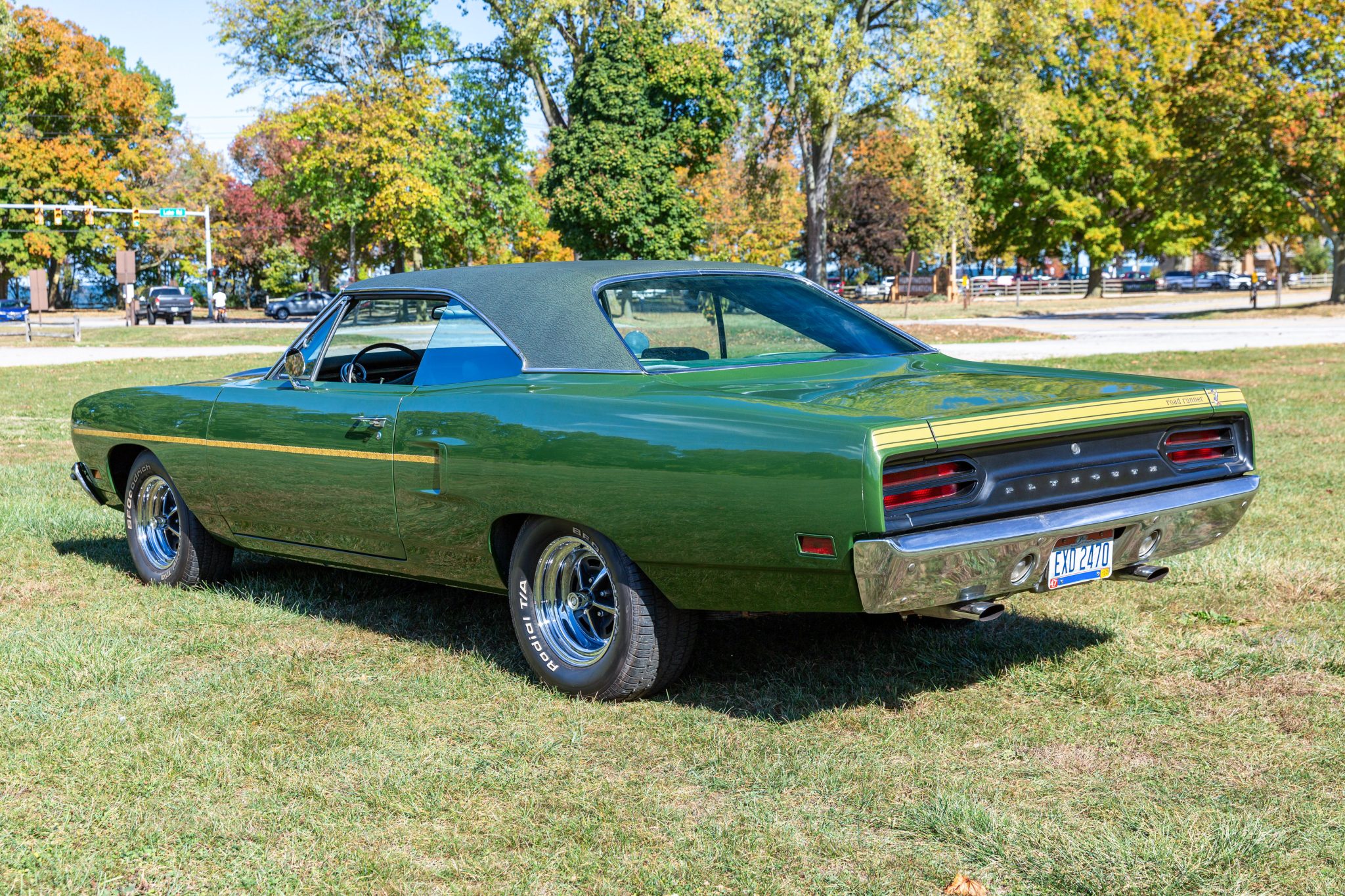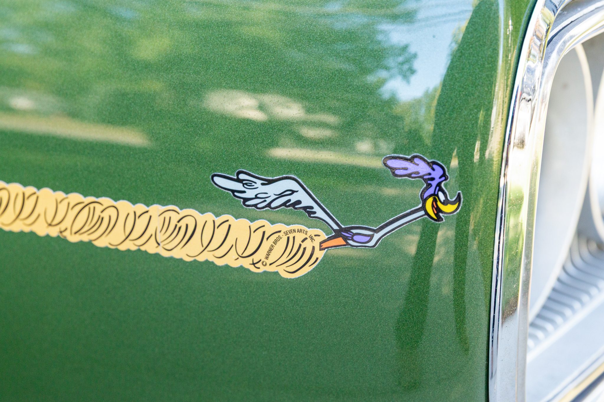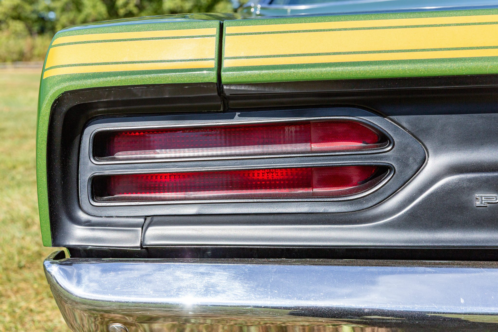 Finished from the factory in Lime Green Metallic (FF4), the car was repainted under previous ownership and features a green vinyl roof. A Road Runner–style bulged hood with black accents and 440-badging has been installed, and Road Runner graphics have been added at the rear of the vehicle and along its sides. Other exterior equipment includes a black tail panel, dual exhaust outlets, simulated side scoops, dual side mirrors, a bright grille, and chrome bumpers. The seller notes missing trim around the windshield, bubbling paint, and touch-up work.