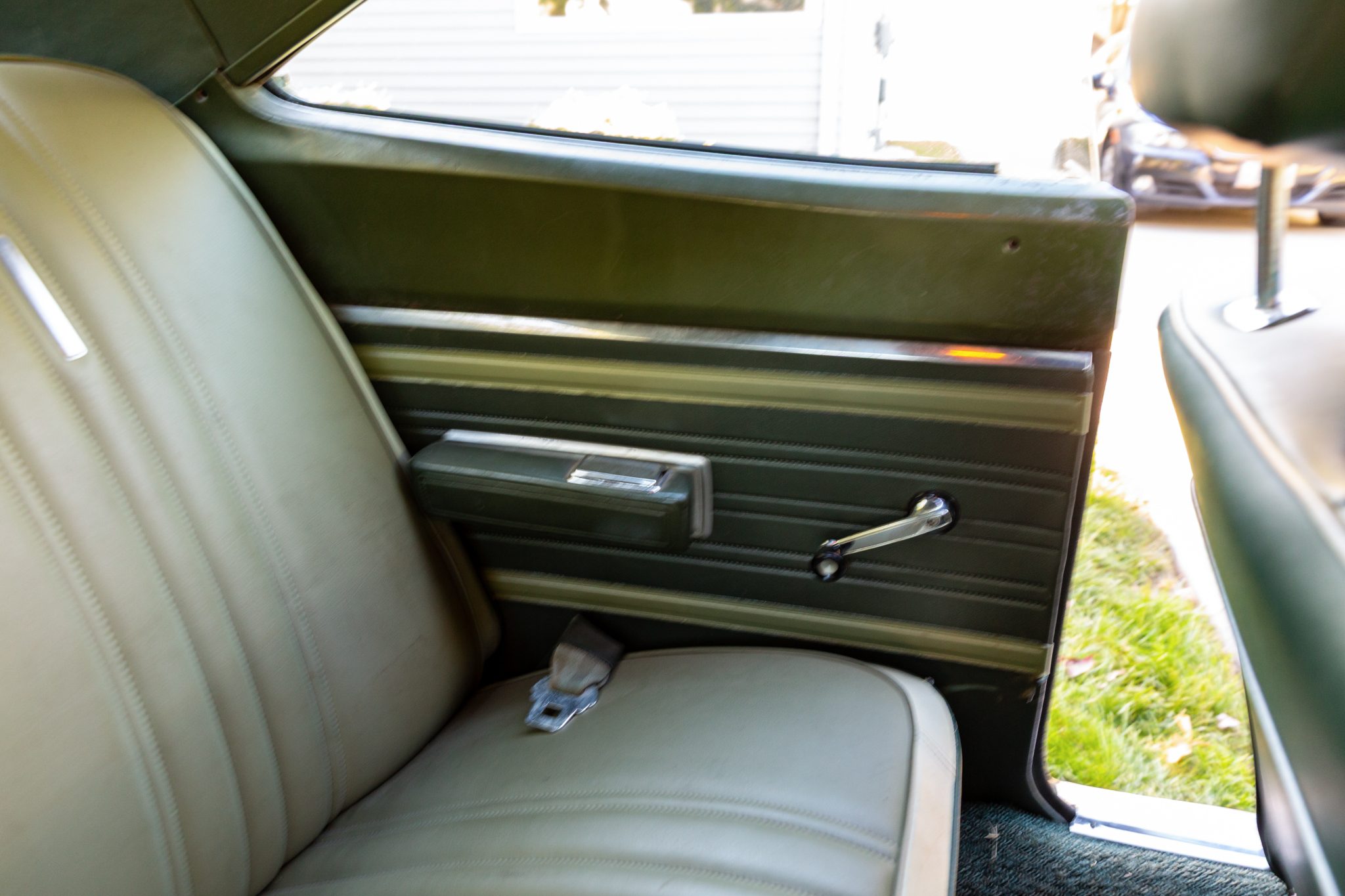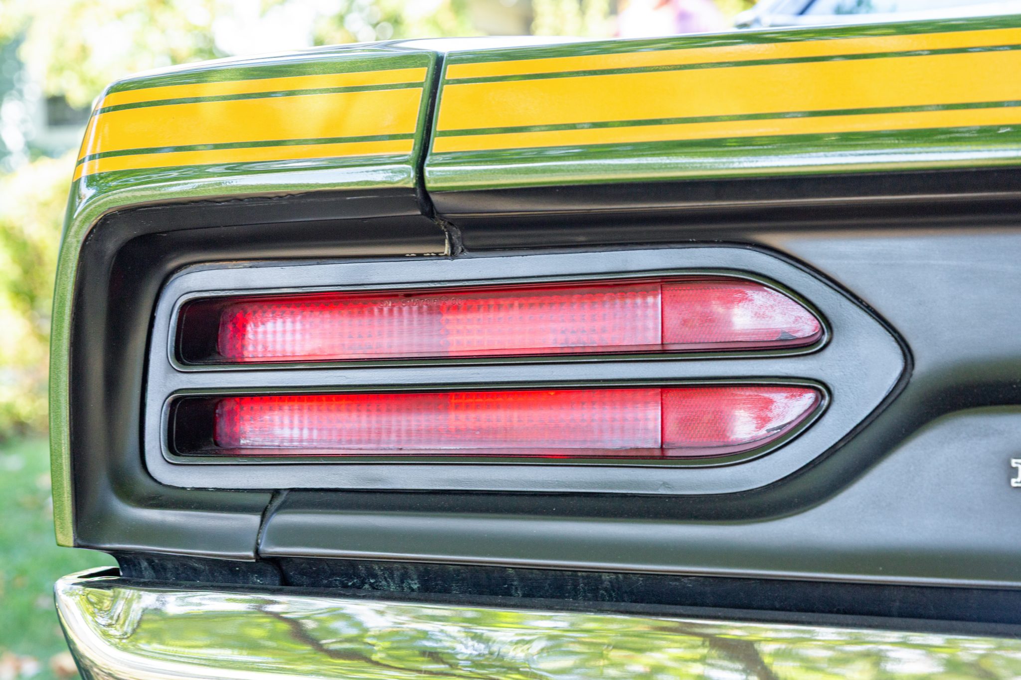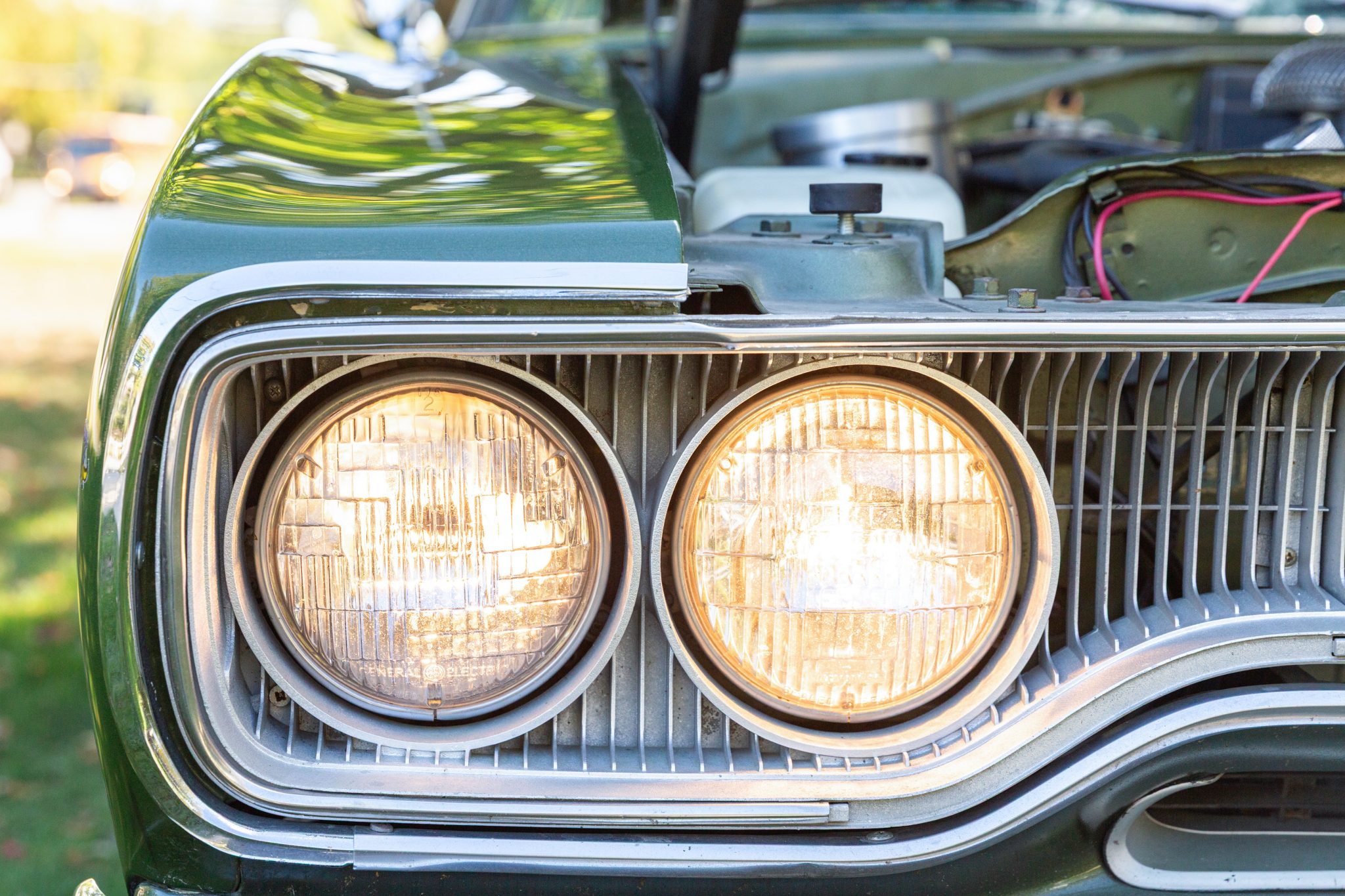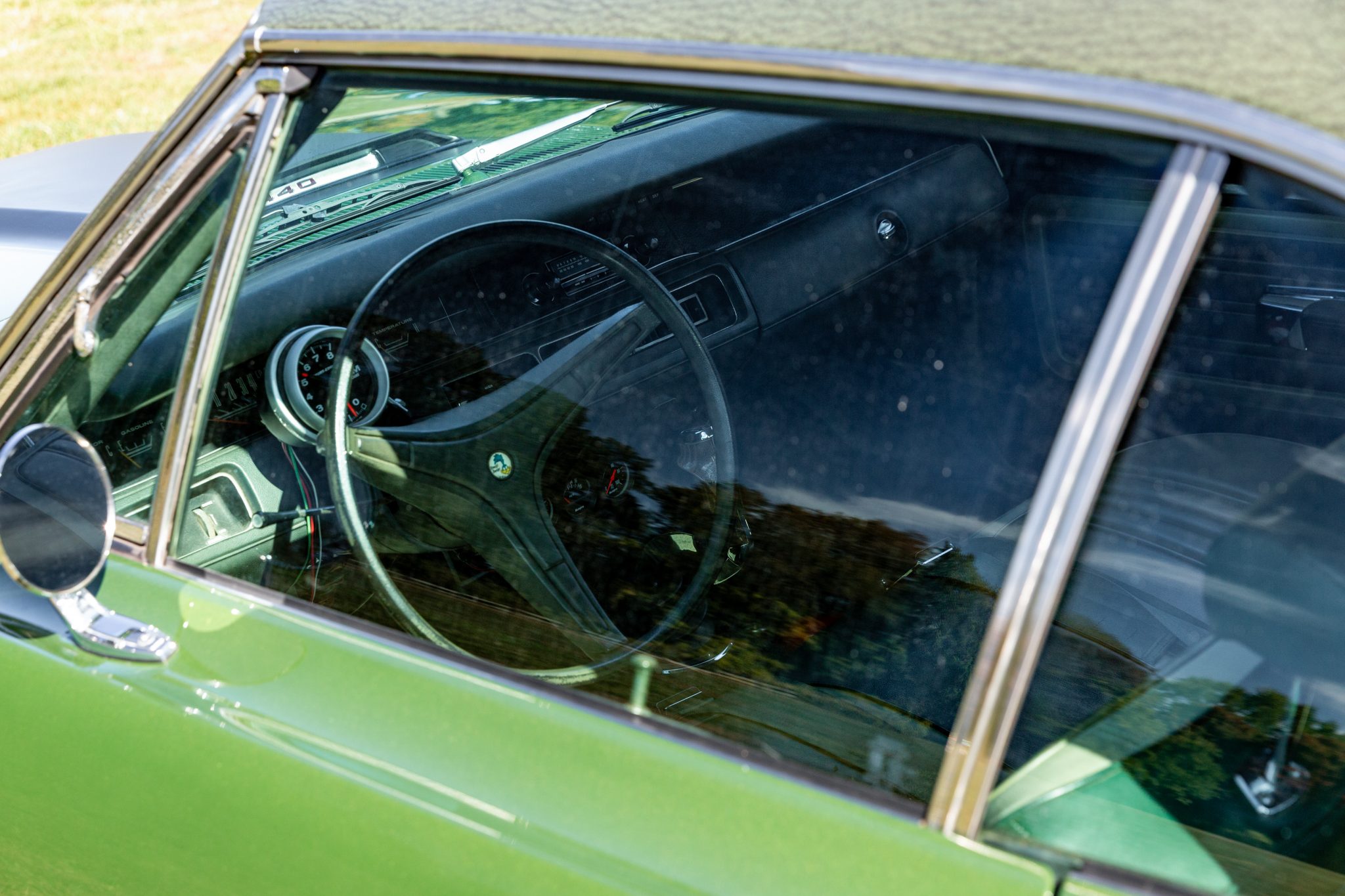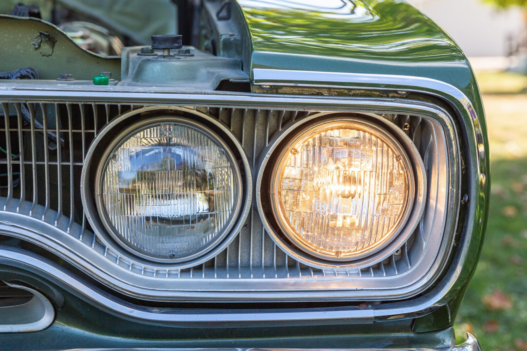 Finished from the factory in Lime Green Metallic (FF4), the car was repainted under previous ownership and features a green vinyl roof. A Road Runner–style bulged hood with black accents and 440-badging has been installed, and Road Runner graphics have been added at the rear of the vehicle and along its sides. Other exterior equipment includes a black tail panel, dual exhaust outlets, simulated side scoops, dual side mirrors, a bright grille, and chrome bumpers. The seller notes missing trim around the windshield, bubbling paint, and touch-up work.