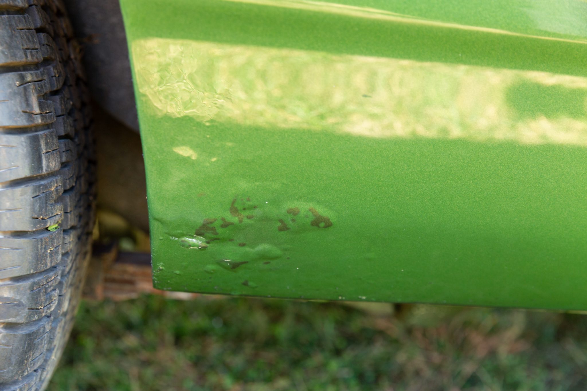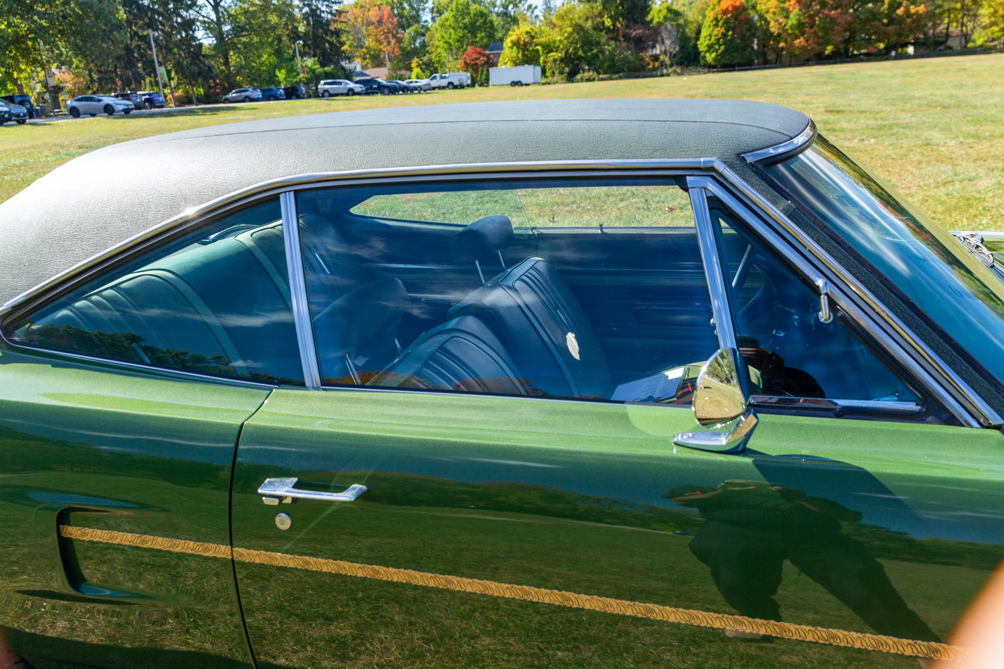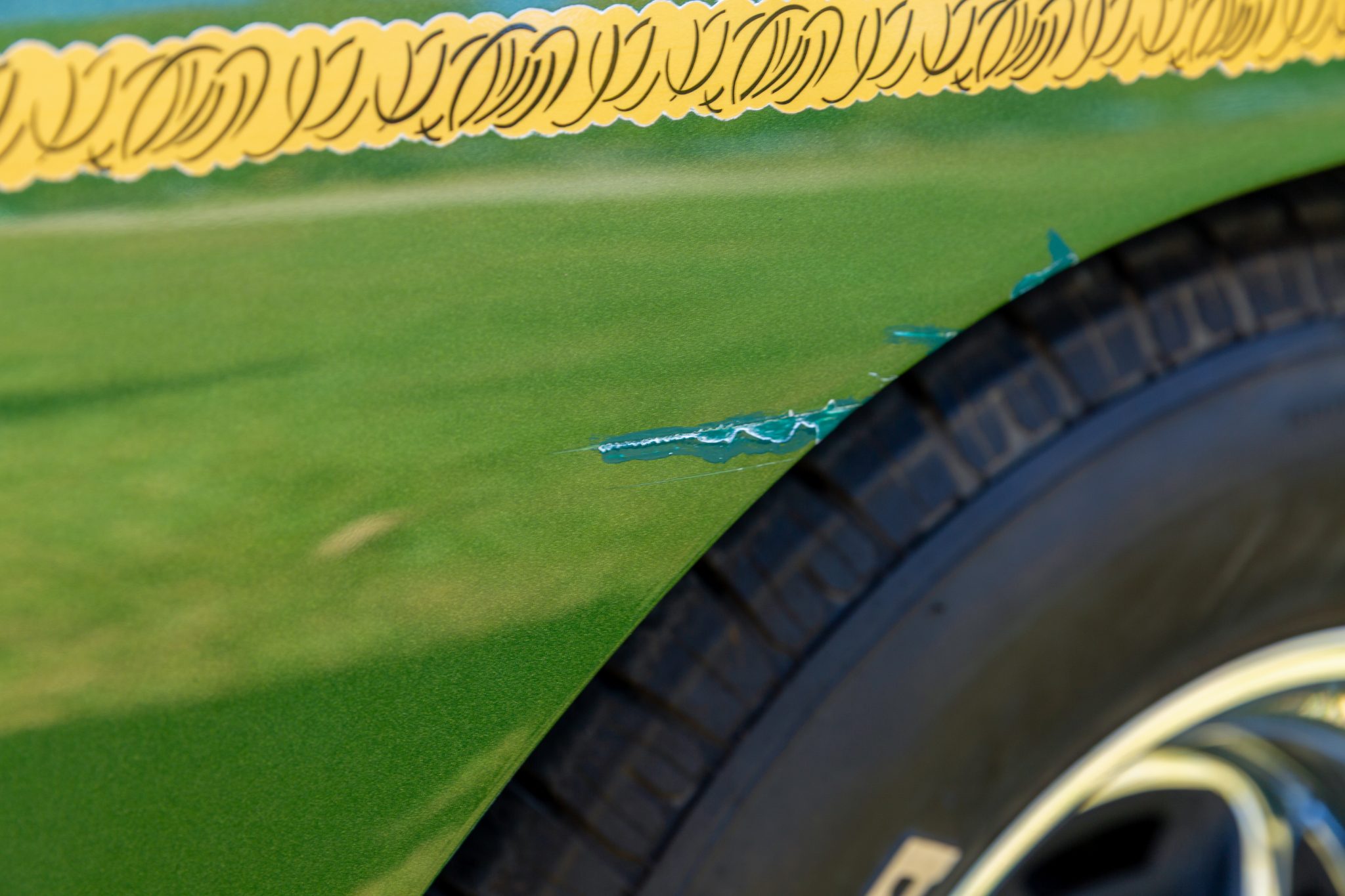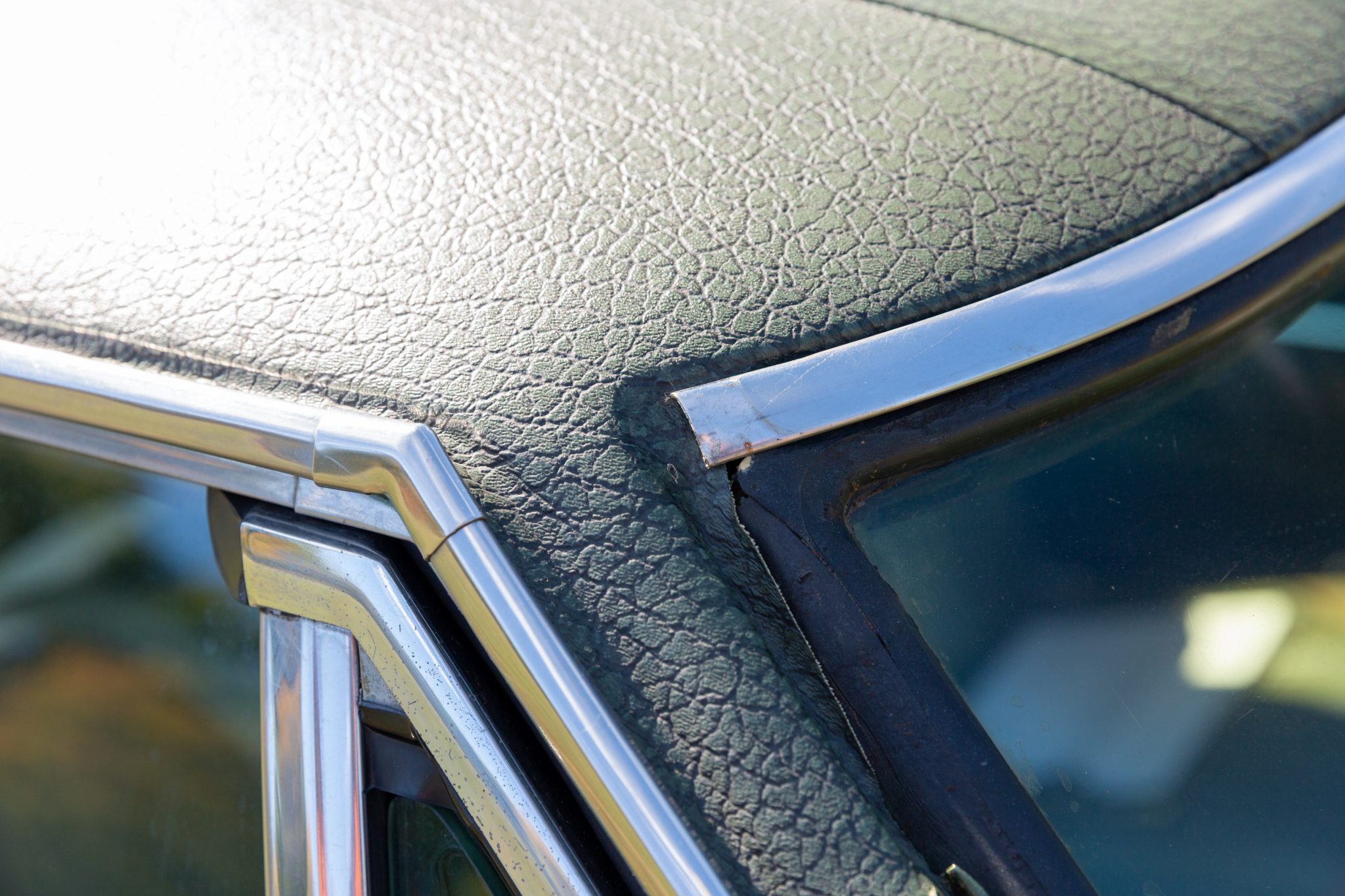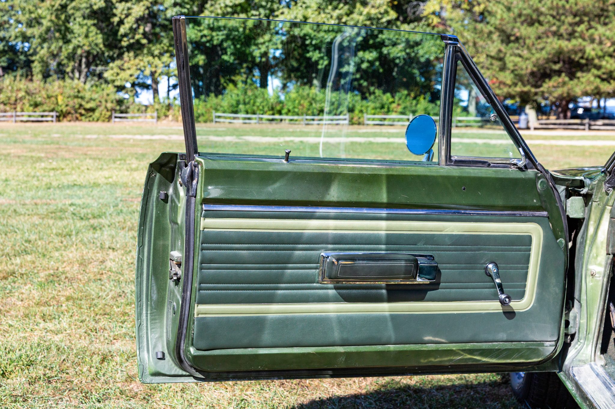 Finished from the factory in Lime Green Metallic (FF4), the car was repainted under previous ownership and features a green vinyl roof. A Road Runner–style bulged hood with black accents and 440-badging has been installed, and Road Runner graphics have been added at the rear of the vehicle and along its sides. Other exterior equipment includes a black tail panel, dual exhaust outlets, simulated side scoops, dual side mirrors, a bright grille, and chrome bumpers. The seller notes missing trim around the windshield, bubbling paint, and touch-up work.