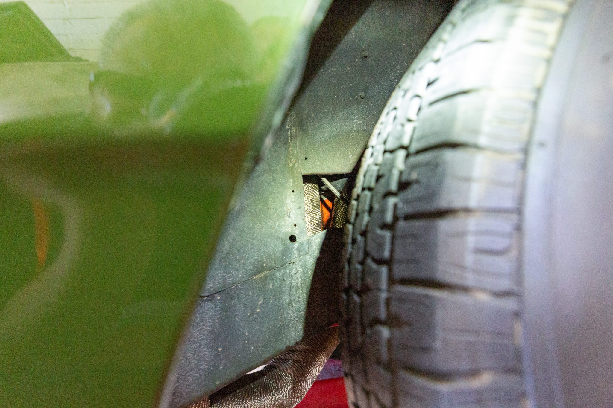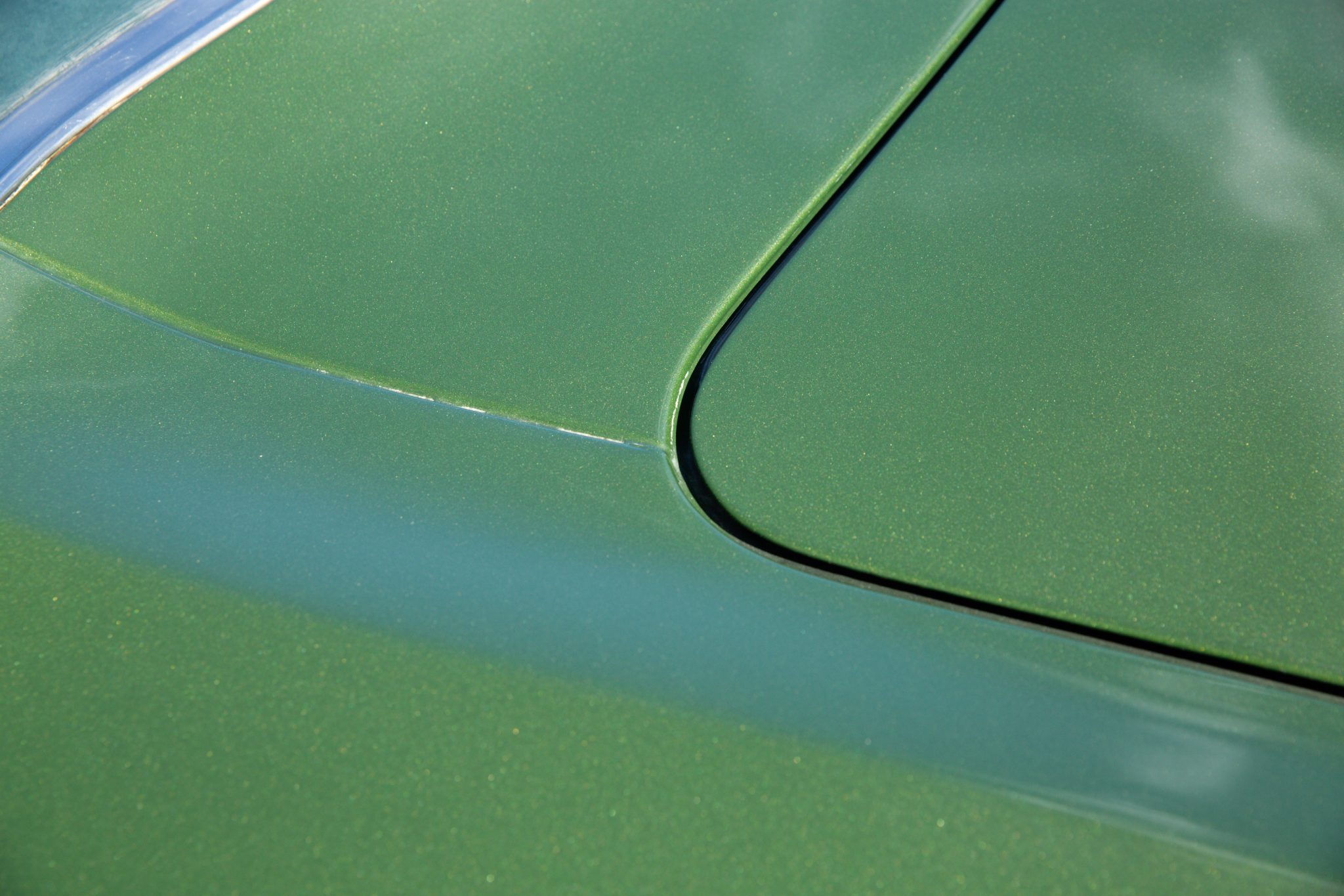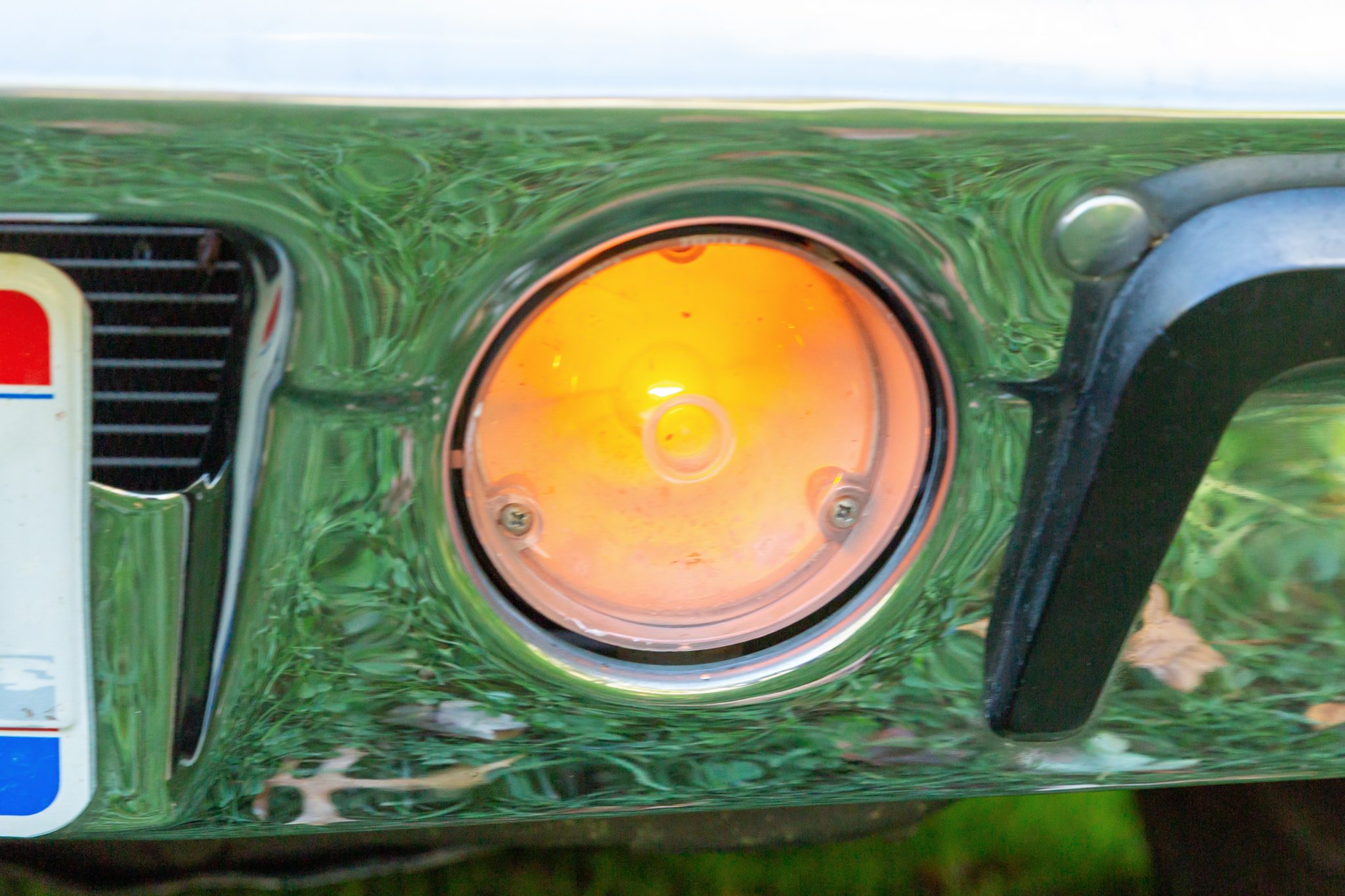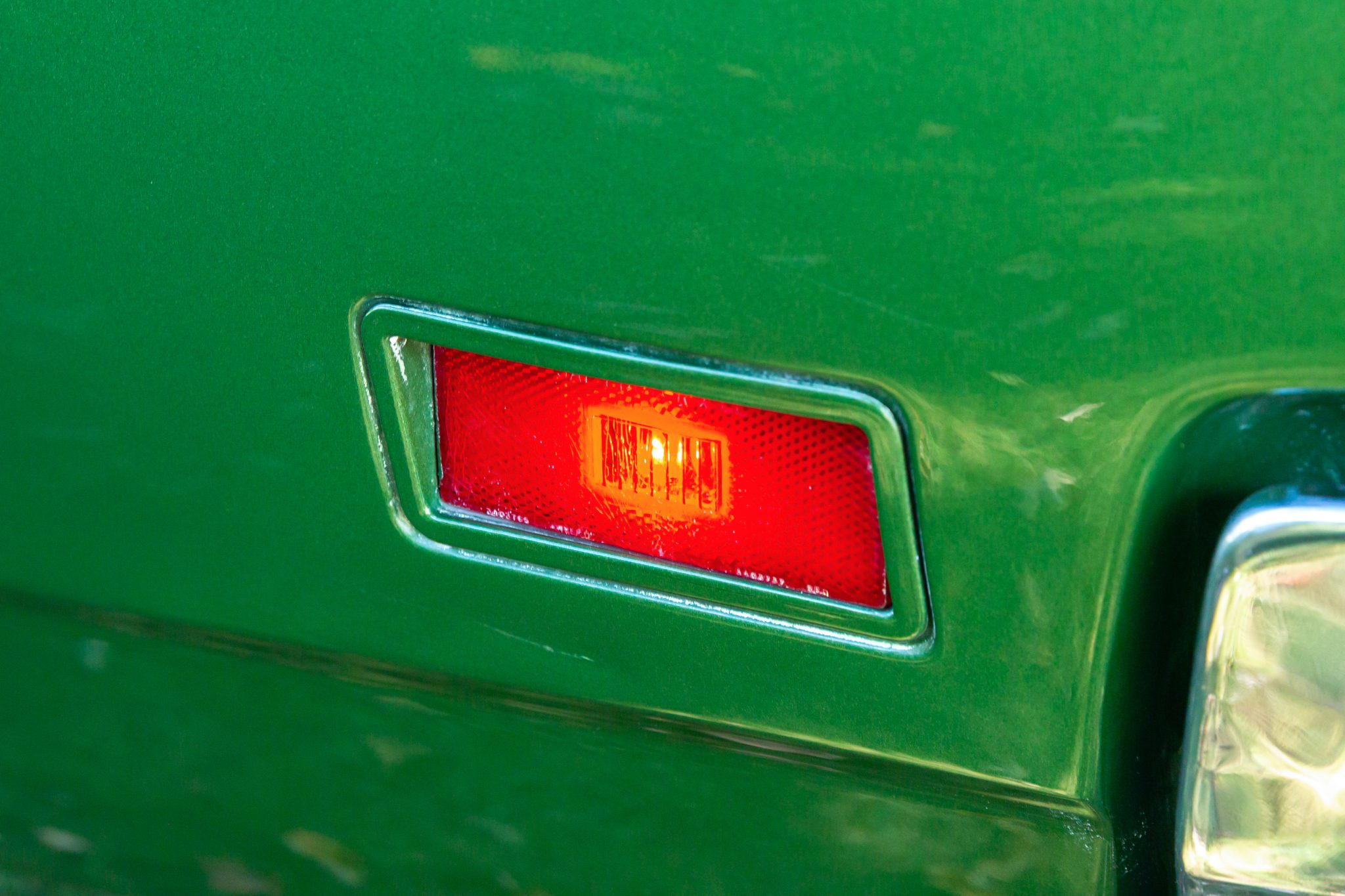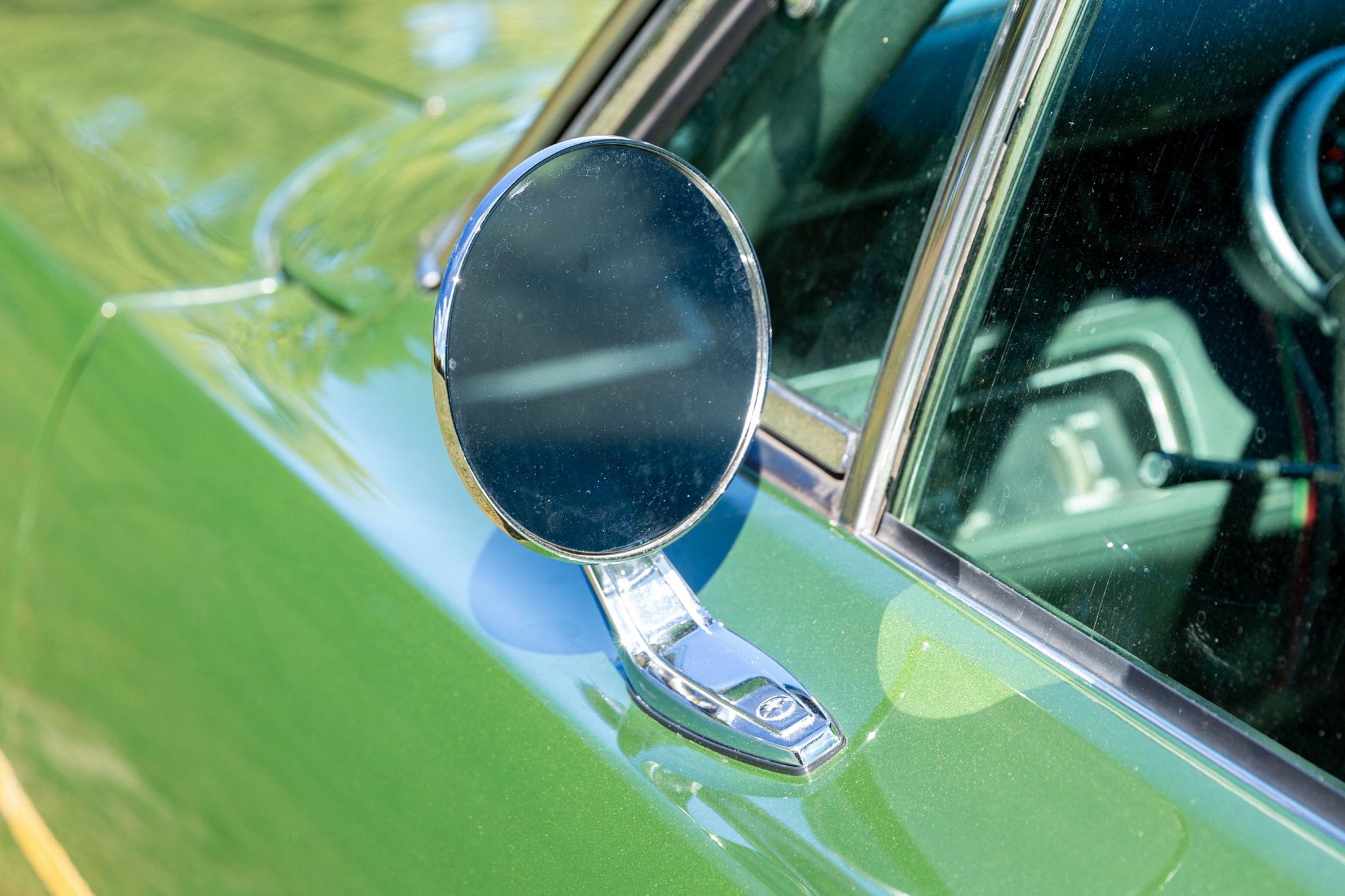 Finished from the factory in Lime Green Metallic (FF4), the car was repainted under previous ownership and features a green vinyl roof. A Road Runner–style bulged hood with black accents and 440-badging has been installed, and Road Runner graphics have been added at the rear of the vehicle and along its sides. Other exterior equipment includes a black tail panel, dual exhaust outlets, simulated side scoops, dual side mirrors, a bright grille, and chrome bumpers. The seller notes missing trim around the windshield, bubbling paint, and touch-up work.