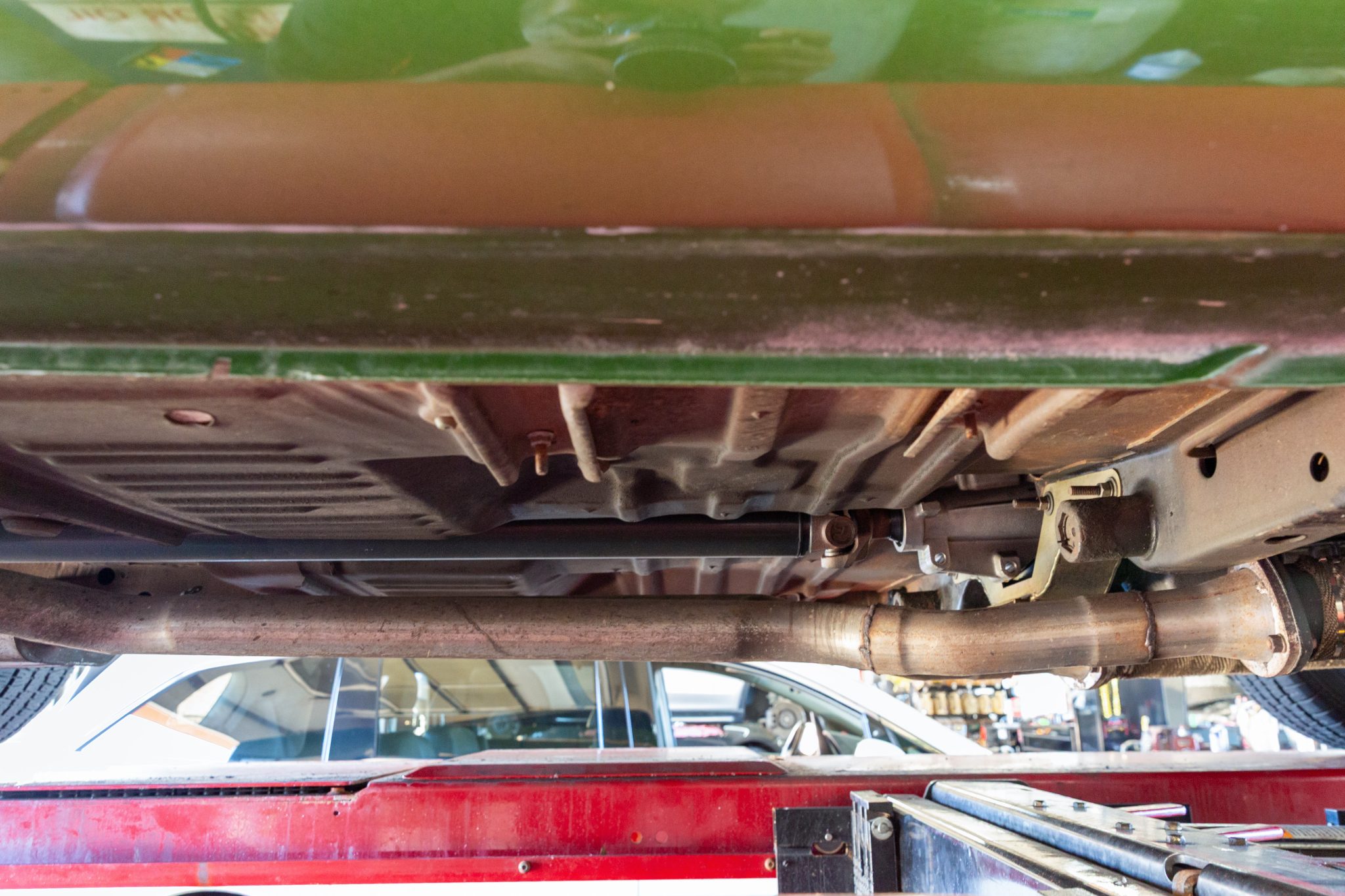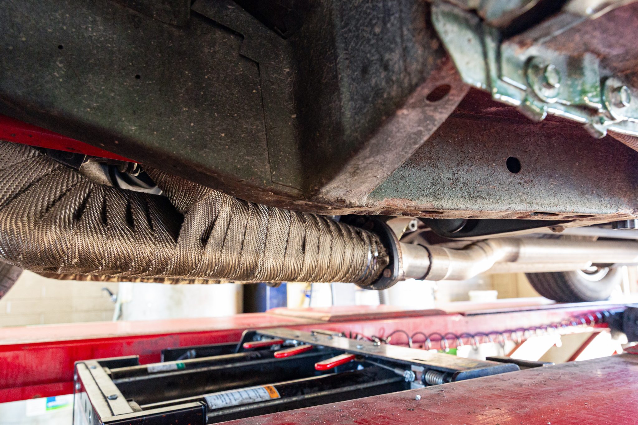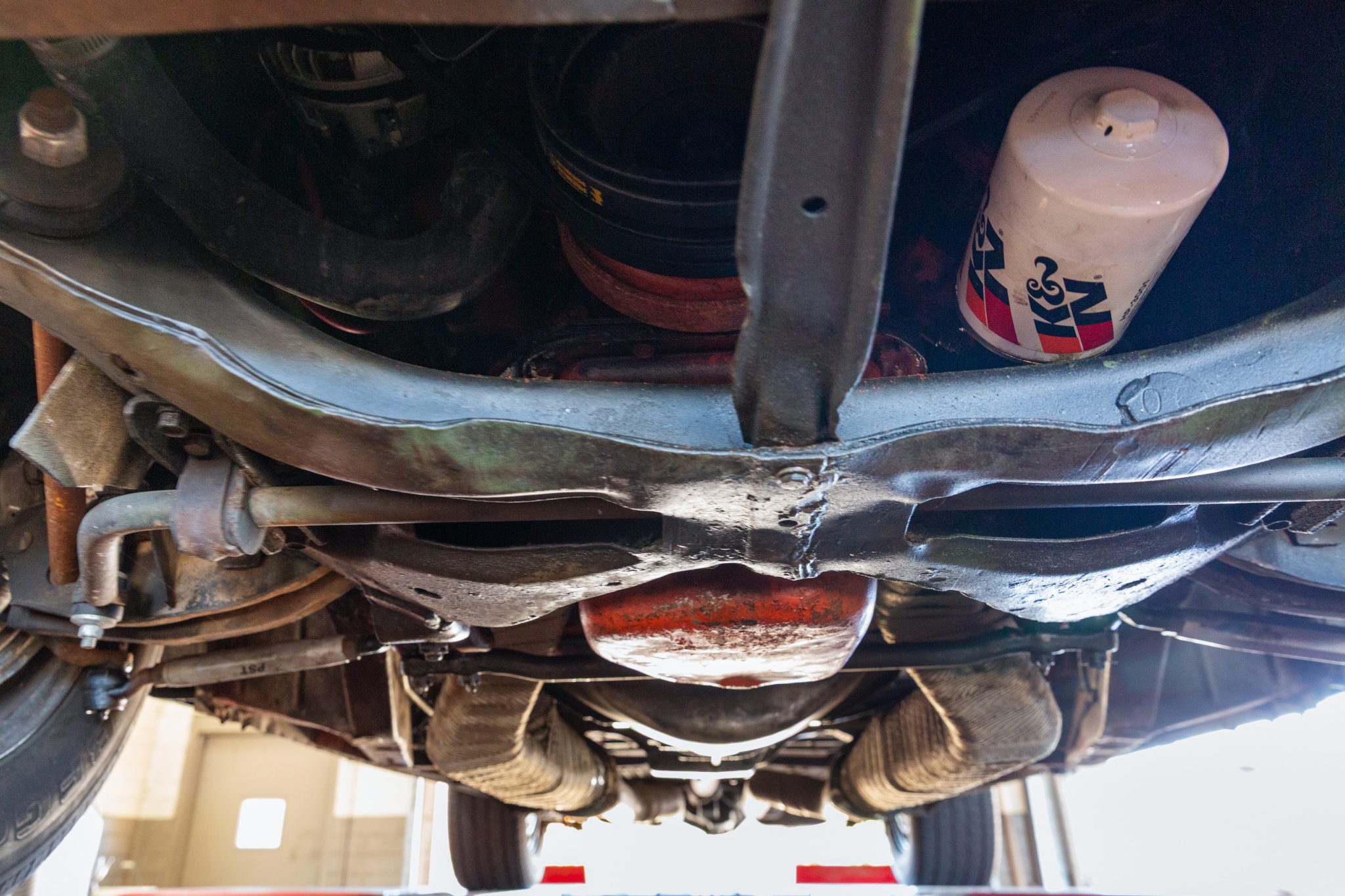 Power is sent to the rear wheels through a Tremec five-speed manual transmission and a Dana 60 limited-slip rear end with 3.91:1 gears. Corrosion is visible on underbody components.