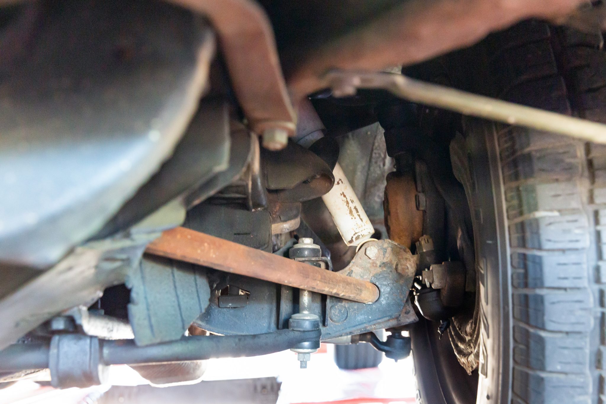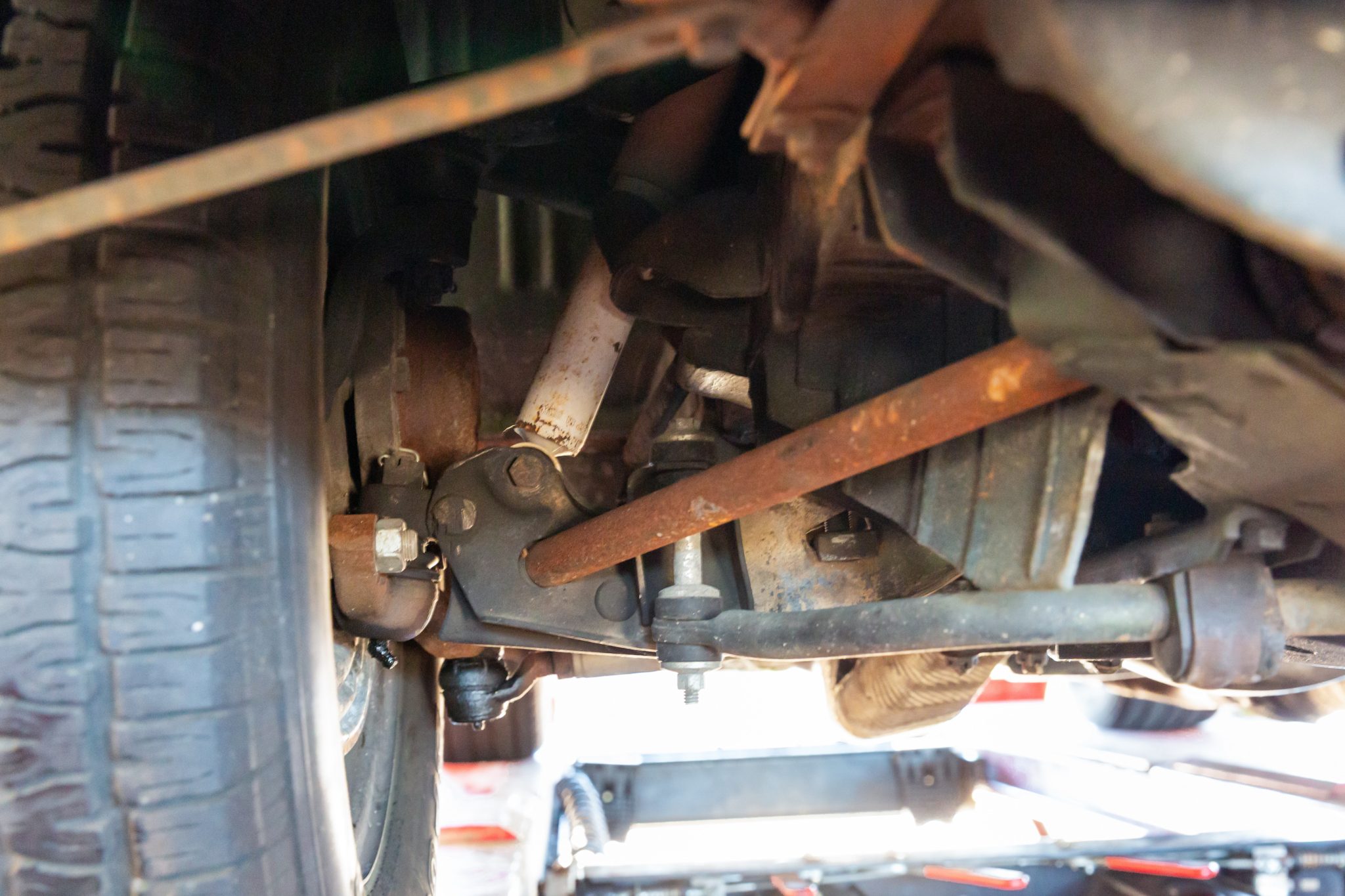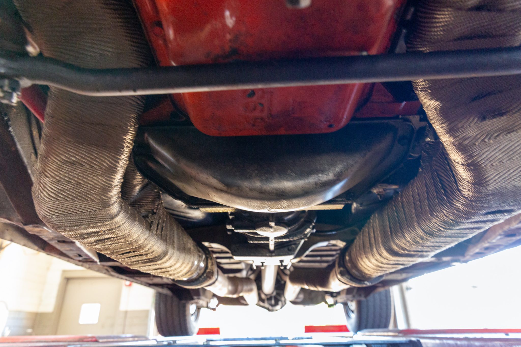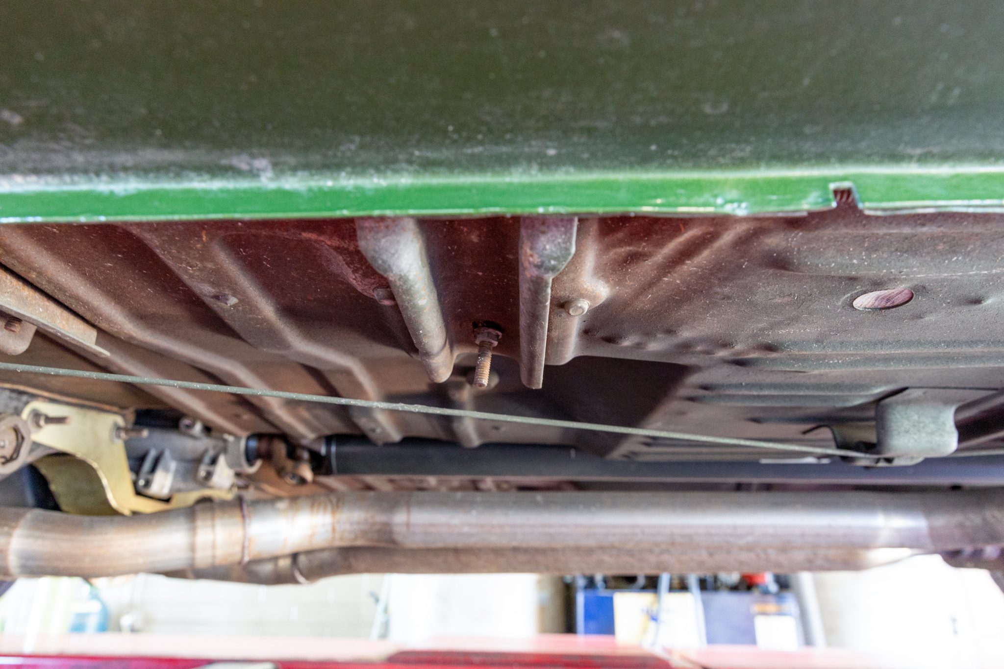 Power is sent to the rear wheels through a Tremec five-speed manual transmission and a Dana 60 limited-slip rear end with 3.91:1 gears. Corrosion is visible on underbody components.