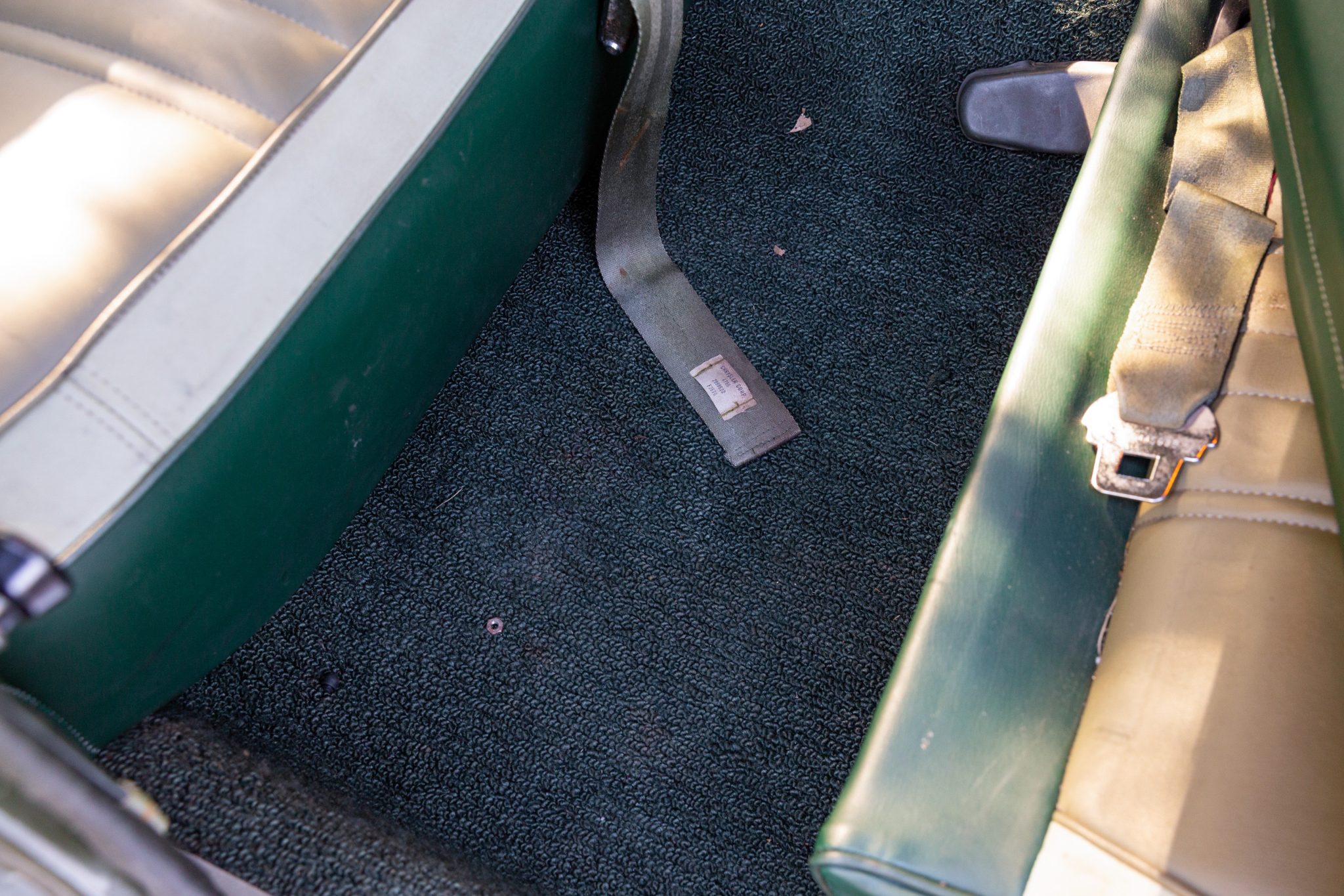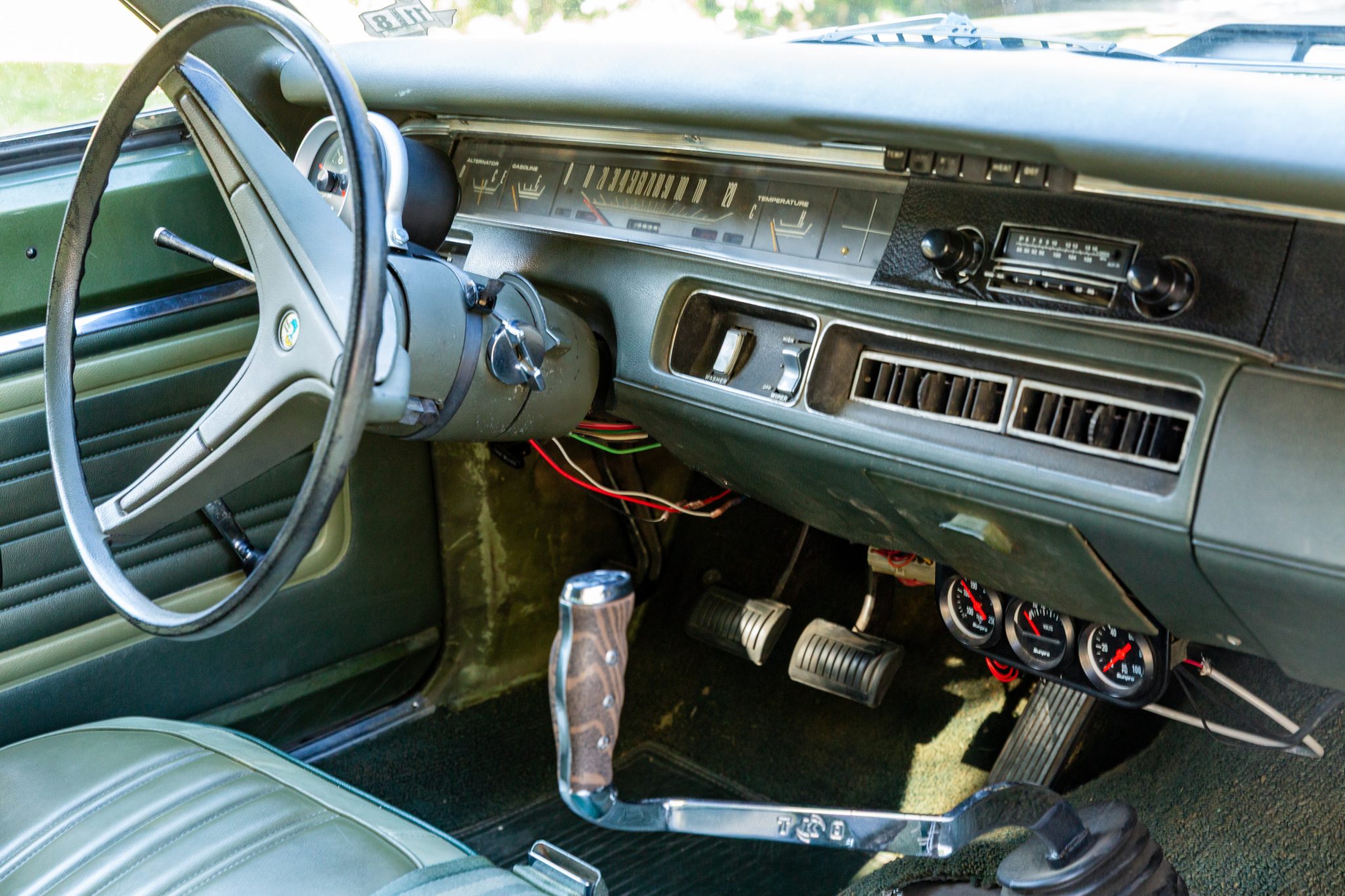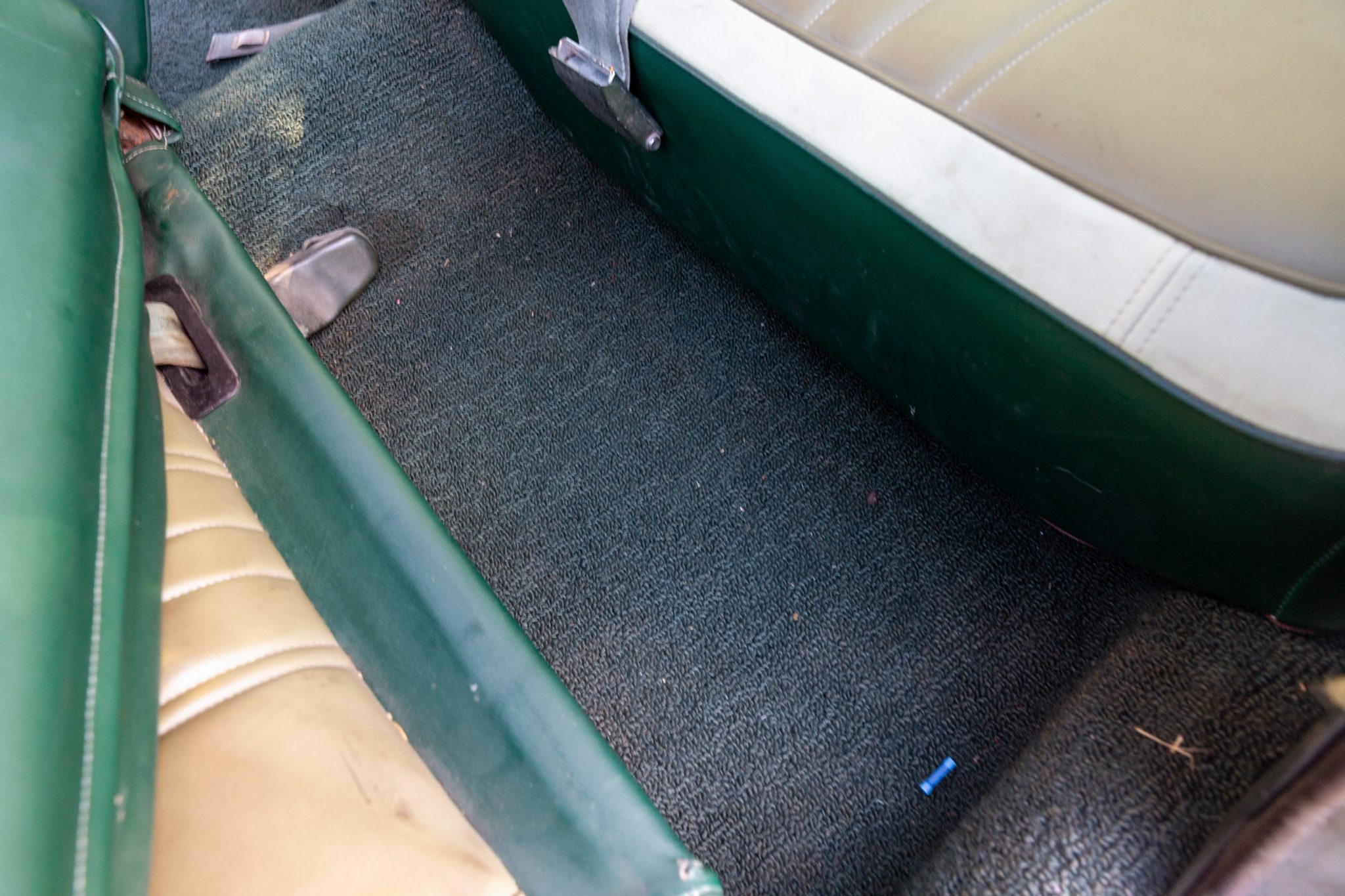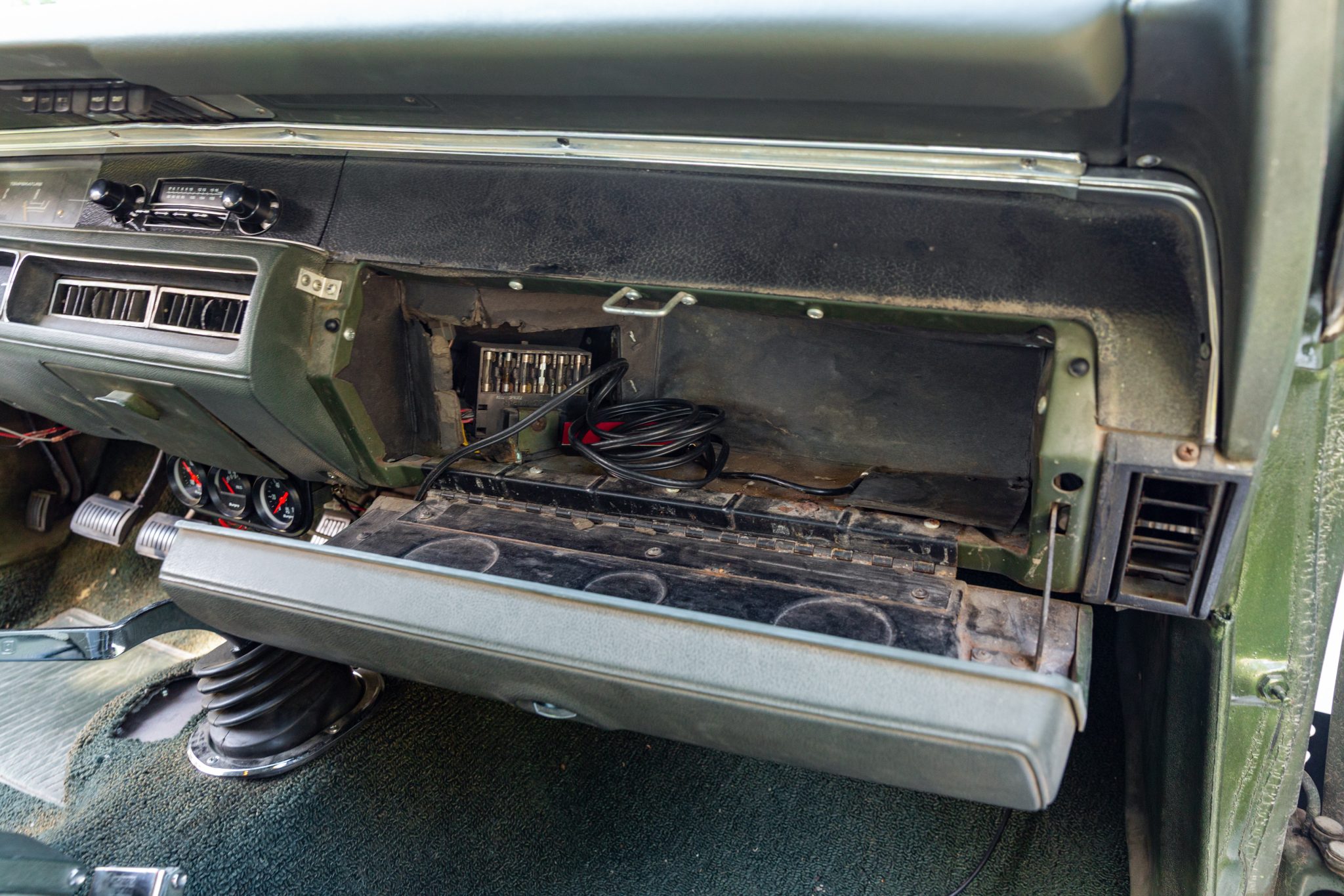 The bench seating surfaces are trimmed in vinyl with multiple shades of green upholstery separated by white sections. Appointments include green headrests, a pistol-grip shifter, front and rear seatbelts, and an aftermarket AM/FM radio with an auxiliary input. The air conditioning and heater components have been disconnected, the radio works intermittently, the front-seat adjuster mechanism is broken, and there is a hole in the carpeting near the shifter base. The seller also notes that rust is visible in the trunk compartment, and a leak is evident at the passenger side of the firewall.