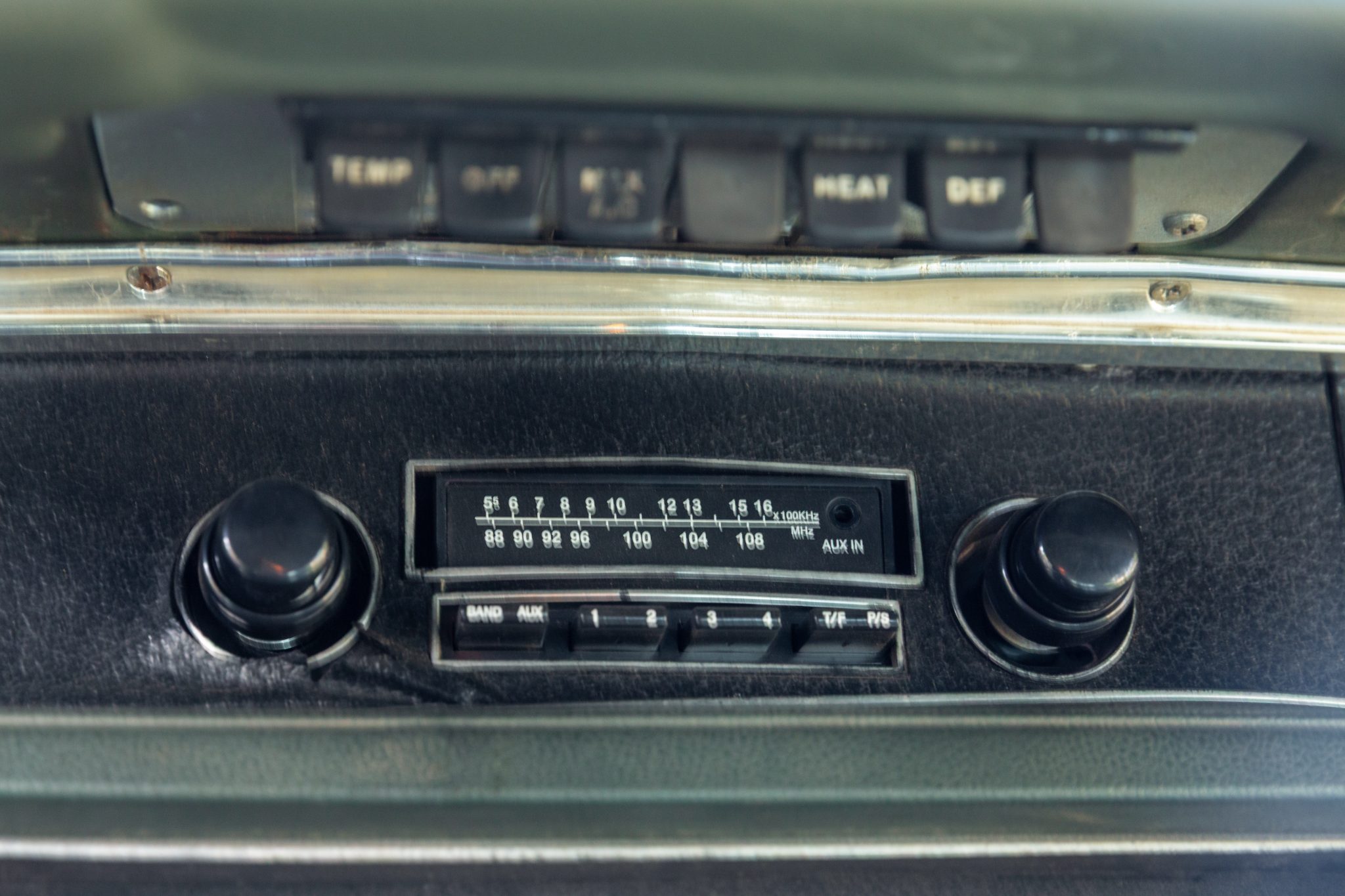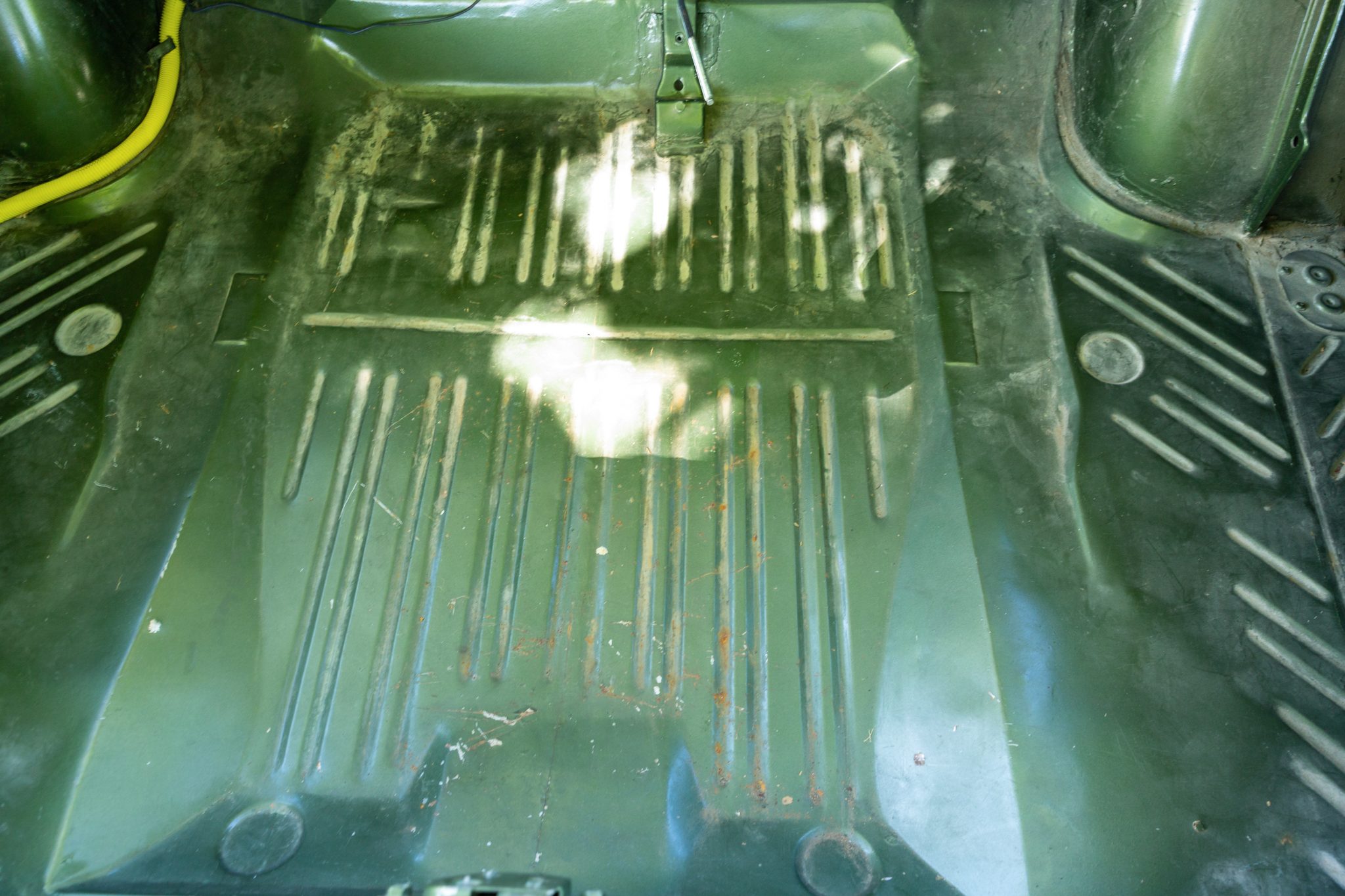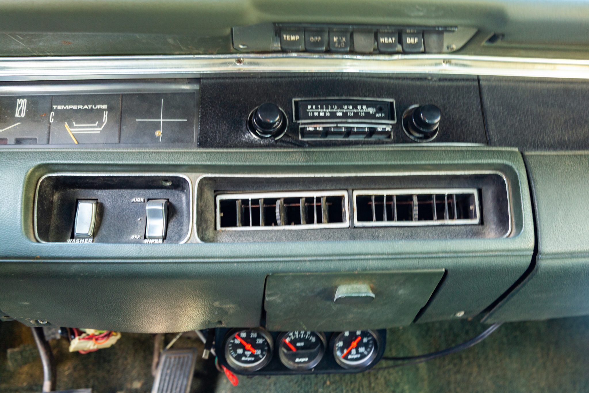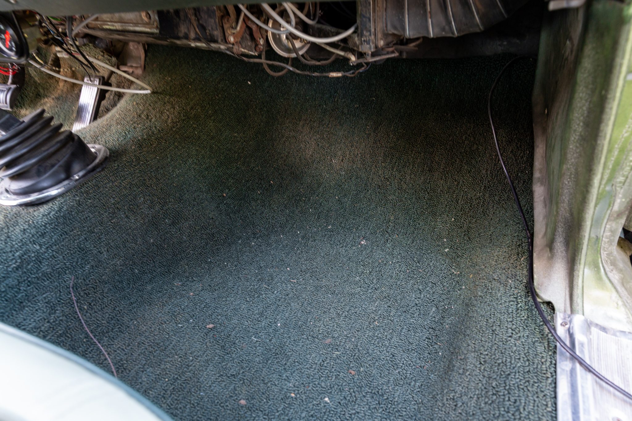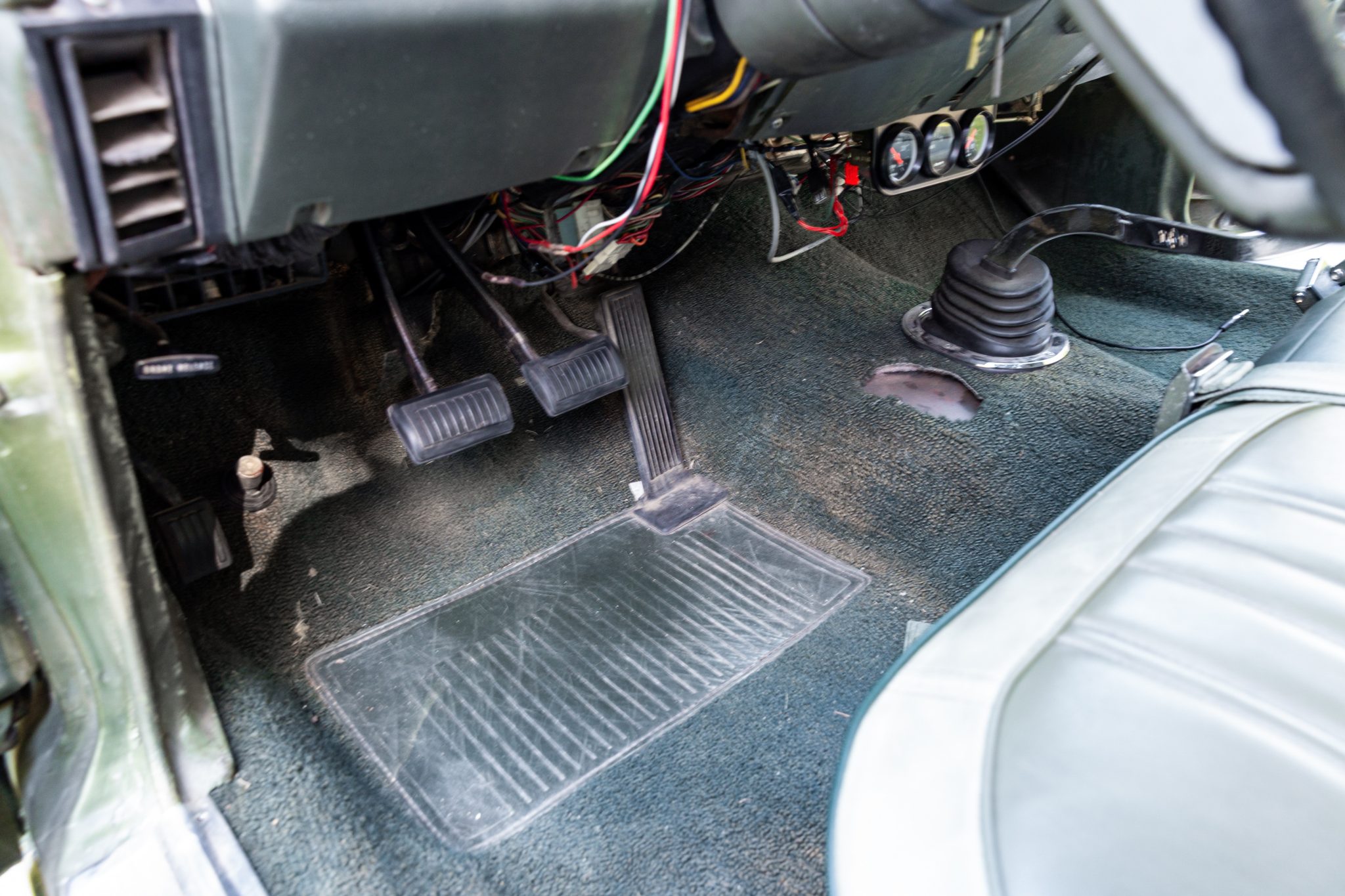 The bench seating surfaces are trimmed in vinyl with multiple shades of green upholstery separated by white sections. Appointments include green headrests, a pistol-grip shifter, front and rear seatbelts, and an aftermarket AM/FM radio with an auxiliary input. The air conditioning and heater components have been disconnected, the radio works intermittently, the front-seat adjuster mechanism is broken, and there is a hole in the carpeting near the shifter base. The seller also notes that rust is visible in the trunk compartment, and a leak is evident at the passenger side of the firewall.